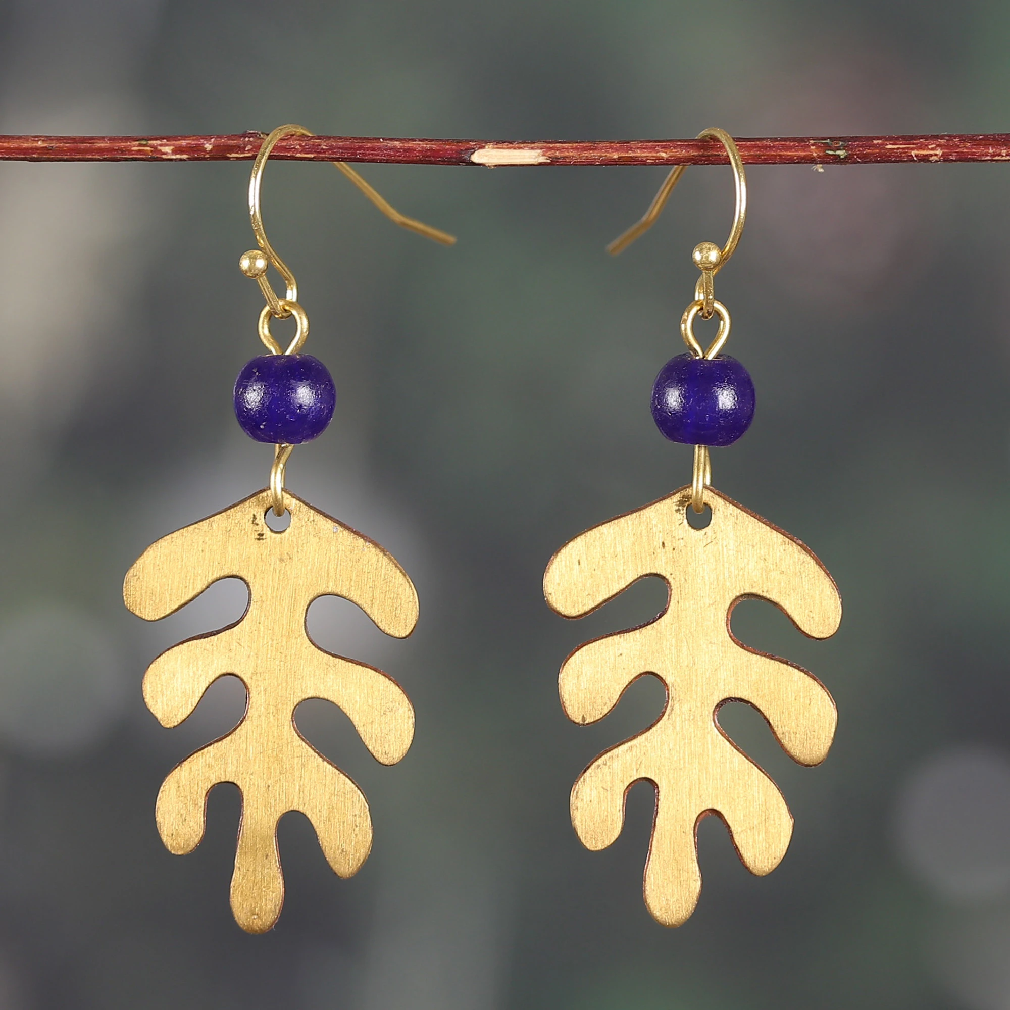 Quartz beads in a bold blue hue are perfectly balanced by the warm glow of brass leaves in these gorgeous dangle earrings. Designed by India's Sabir, their antique finish creates depth and character that catch every eye. These nature-inspired earrings are the perfect companion for casual outings and more formal occasions.