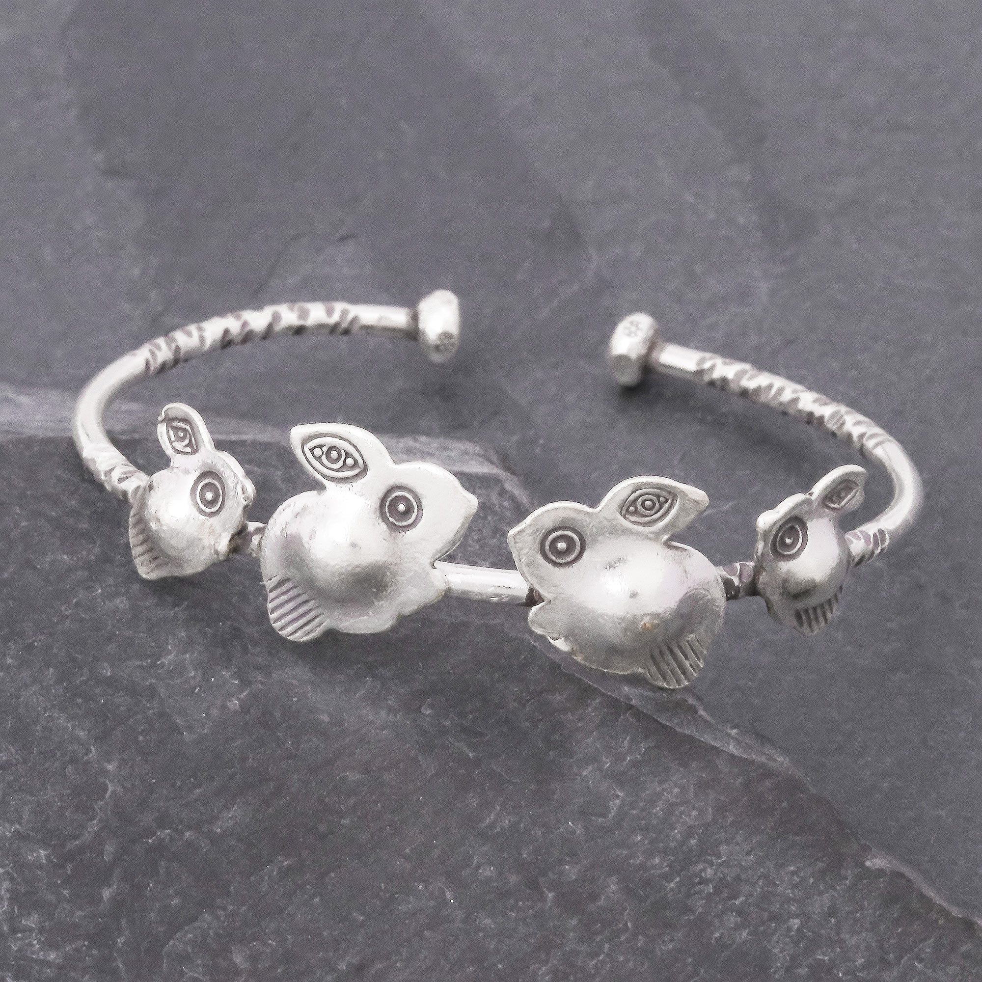 Rabbit Themed 950 Silver Cuff Bracelet, 'Rabbit Family'