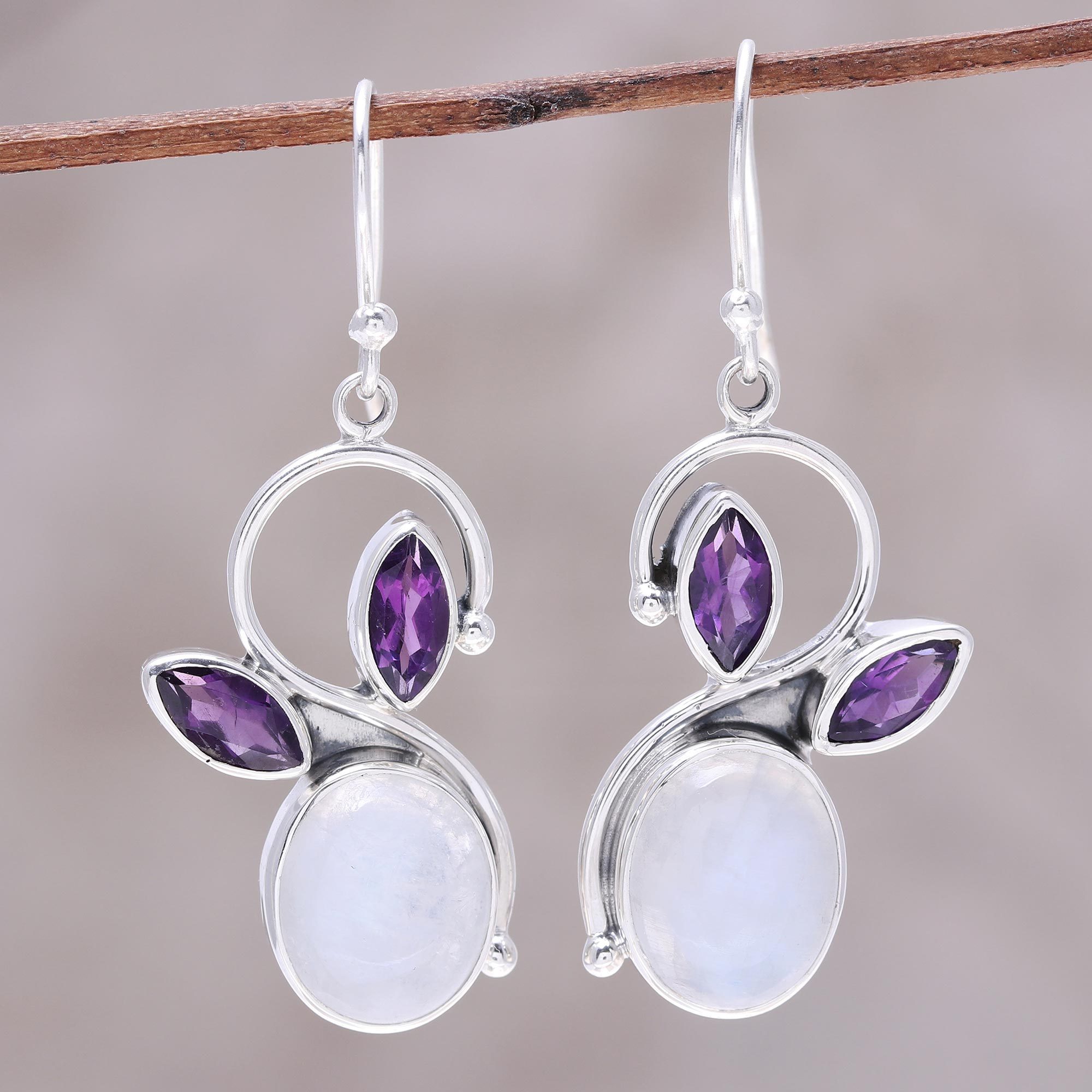 This lovely pair of earrings features a cabochon of rainbow moonstone hanging from a graceful curve of sterling silver wire. Set at the top of the moonstone like a pair of leaves are two marquis-cut faceted amethyst gemstones. These dangle earrings are designed by Shanker of India.