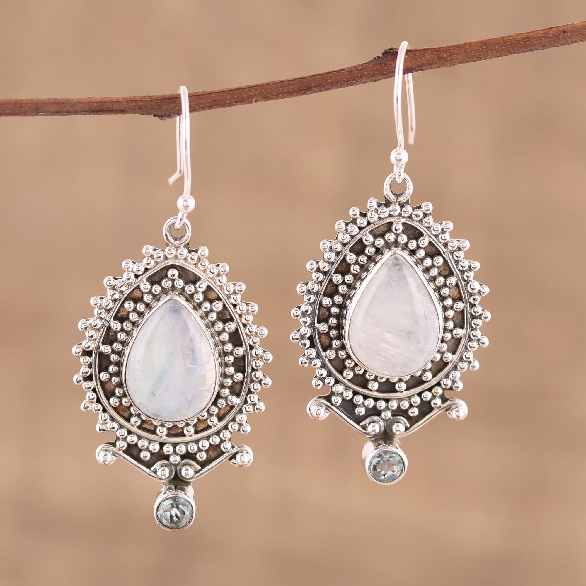 Beautiful rainbow moonstones give off a tranquil vibe in these dangle earrings from Neeru Goel of India. Sterling silver dot motifs surround the drop-shaped gems, while a glistening blue topaz forms the base of each earring.
