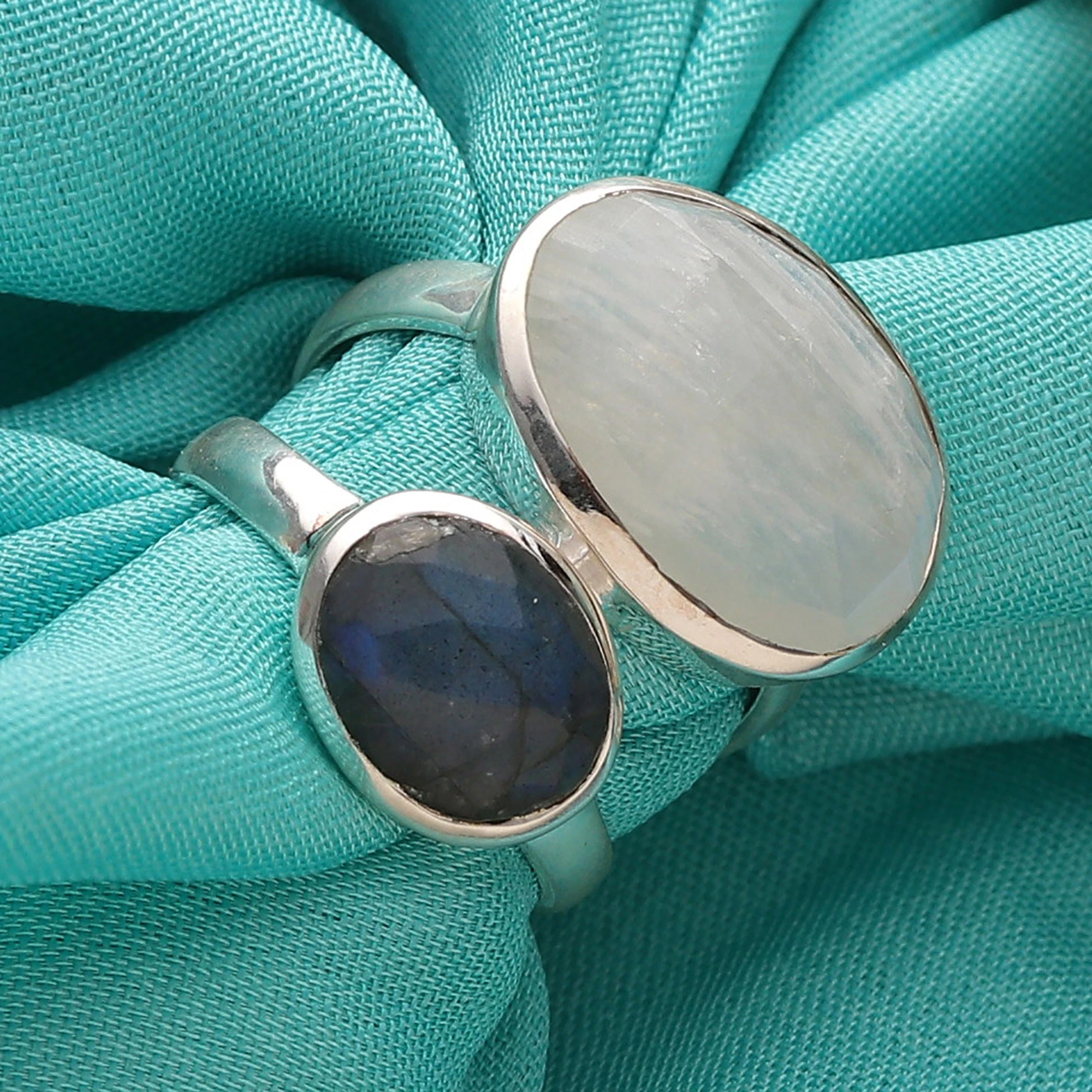 Capturing the elegance of evening, gemstones of rainbow moonstone and labradorite, totaling 17 carats, combine their beauty. India's Neetu Barathi designs this majestic cocktail ring, which circles the finger with a double band of sterling silver.