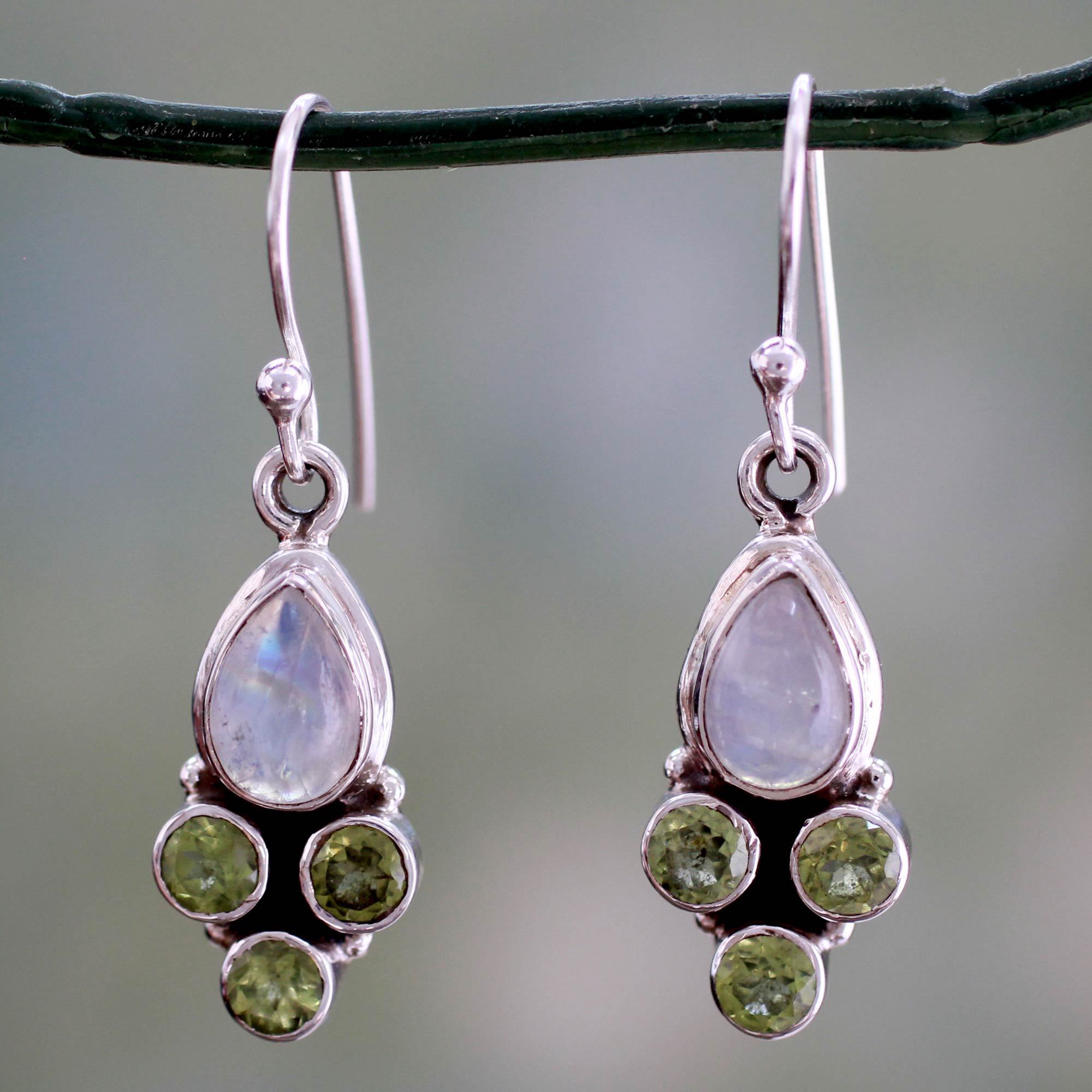 Rainbow moonstone cabochons glow with imagined moonlight in these dangle earrings from Shanker of India. They shine above three faceted peridot stones, apple-green and sparkling. The gemstones are set in polished sterling silver, with a dark oxidized background intended to set off the bright peridot.