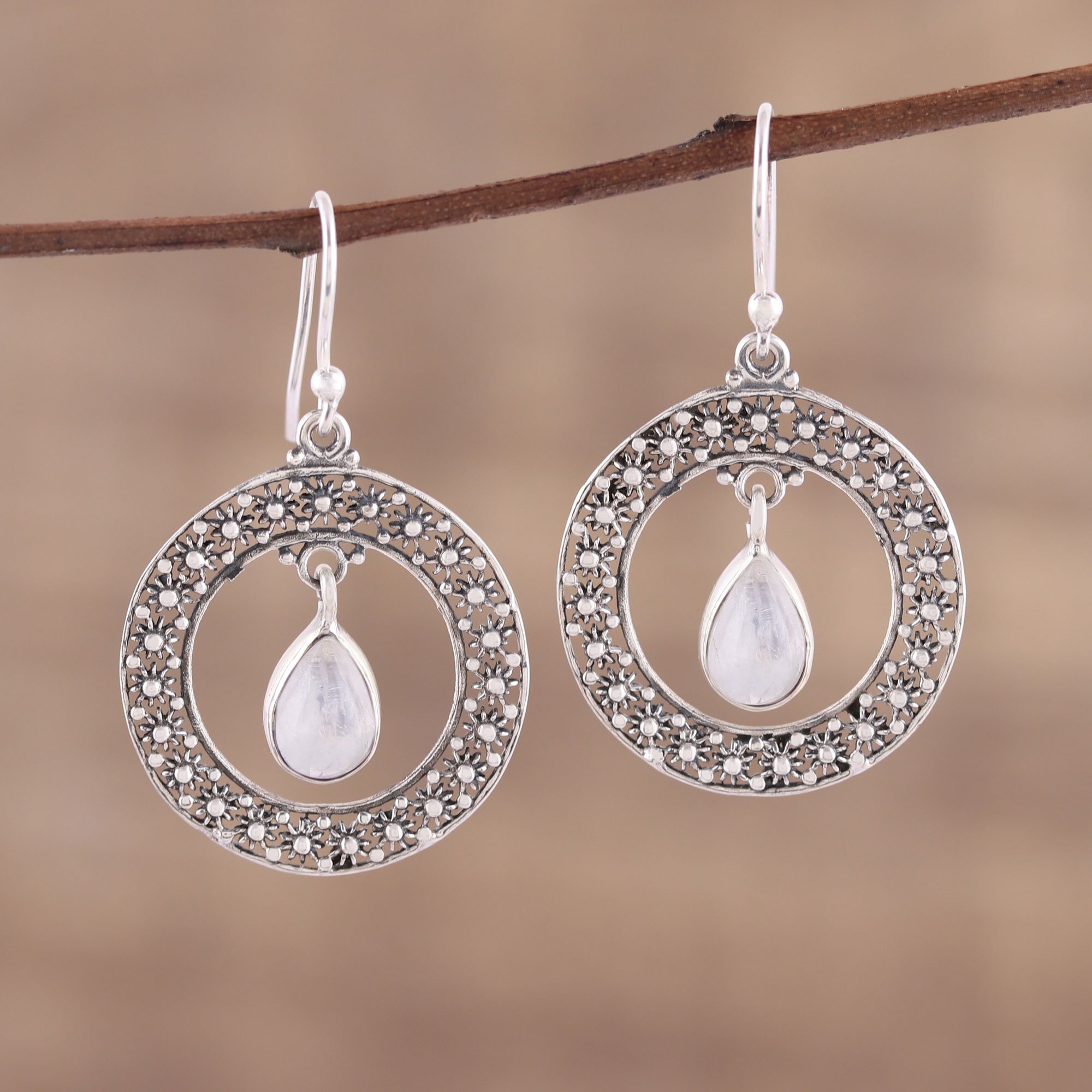 From India's Alok Jain comes these rainbow moonstone and sterling silver dangle earrings which sparkle with a high polish finish. The artisan comments, "Lately, I have been much more involved in the design of jewelry. I'm inspired by nature, hence you will find that most of my jewelry items feature natural motifs." Crafted by hand, the hook earrings consist of a round ring covered with small blossoms; a cabochon rainbow moonstone in a bezel setting swings and sways in the ring's center.