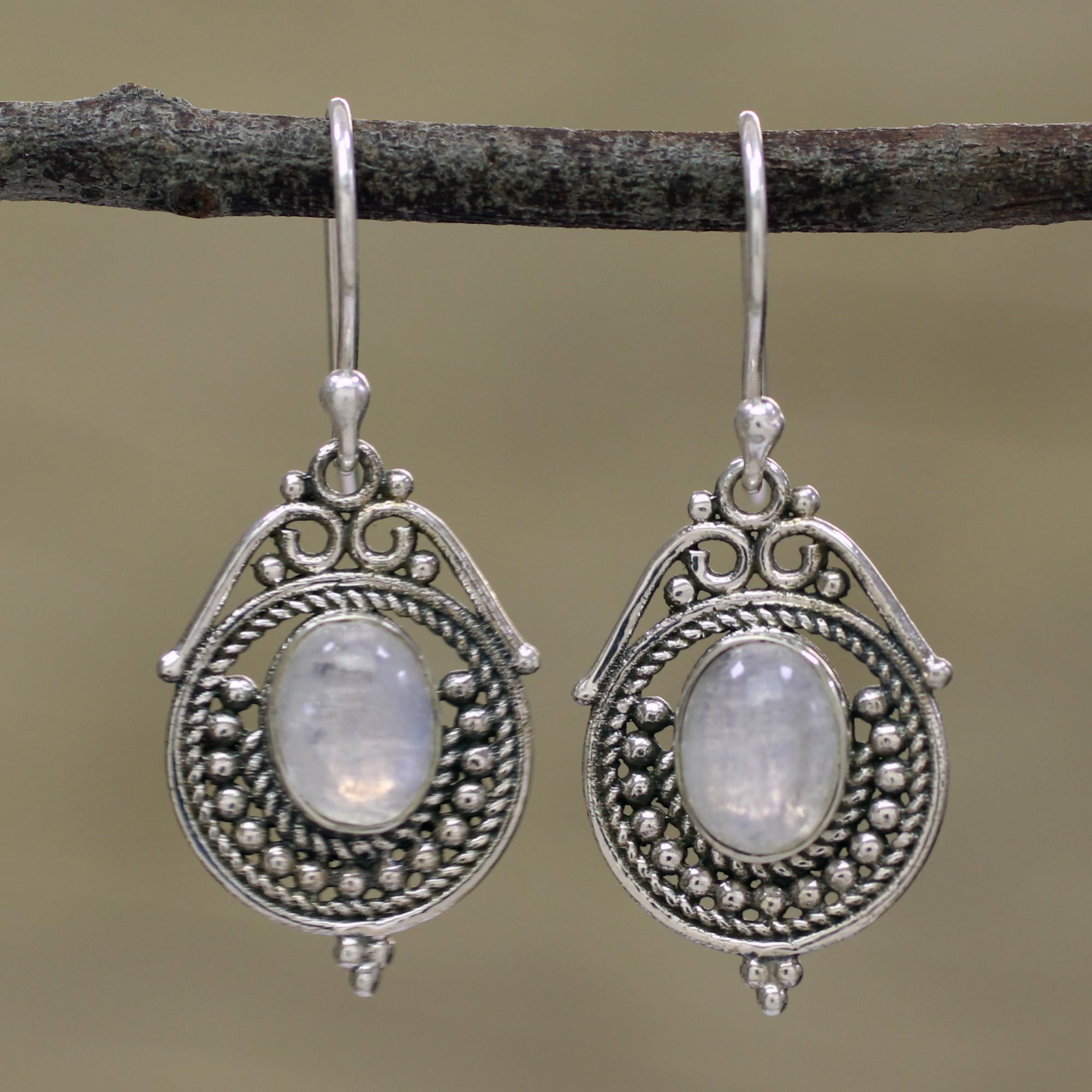 Indian artisans use sterling silver to handcraft these dangle earrings, elaborated with bubble and rope motifs. Parul presents these majestic earrings, fitted with oval cabochons of feminine rainbow moonstone.