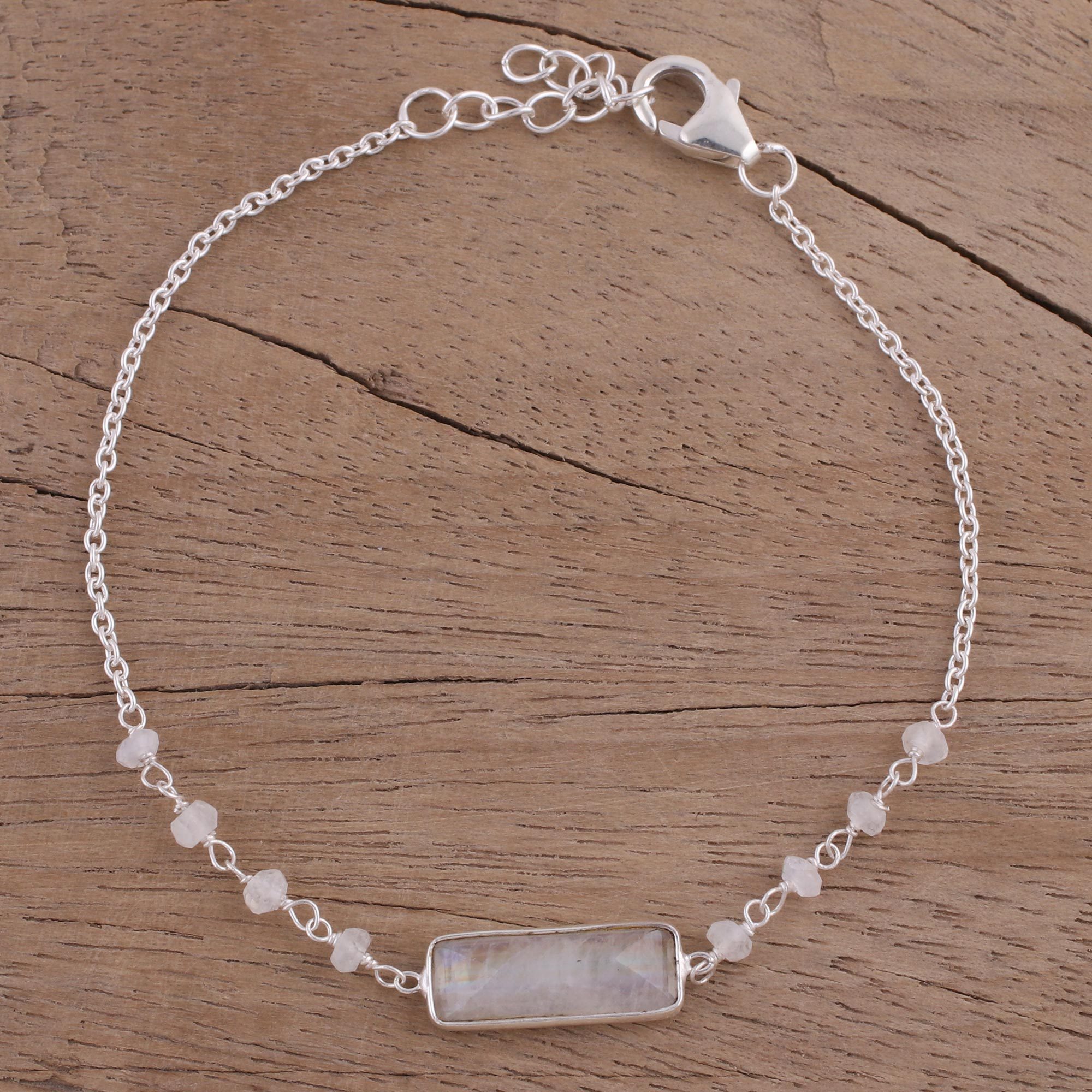 Natural rainbow moonstone beads flank a gleaming prism, decorating the wrist with over three carats of the gemstone altogether. Indian artisan Neetu Barathi designs this magical pendant bracelet, hosting the stones on an adjustable length of sterling silver cable chain.