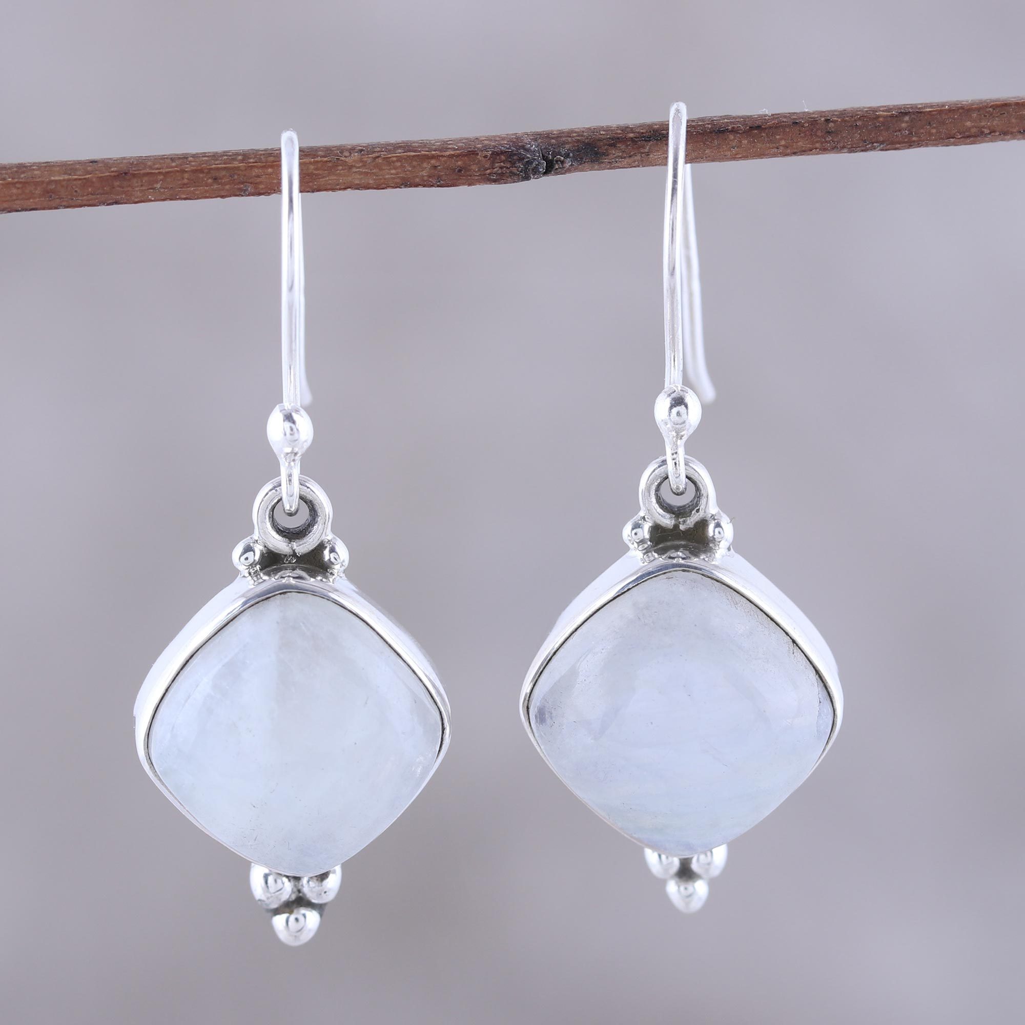 Gleaming with a magnificent grandeur, two cabochons of natural rainbow moonstone are featured in this pair of dangle earrings from India. Shanker, who works with local artisans, presents the beautiful earrings, crafted of sterling silver. Three petite sterling dots decorate each earring at the bottom.