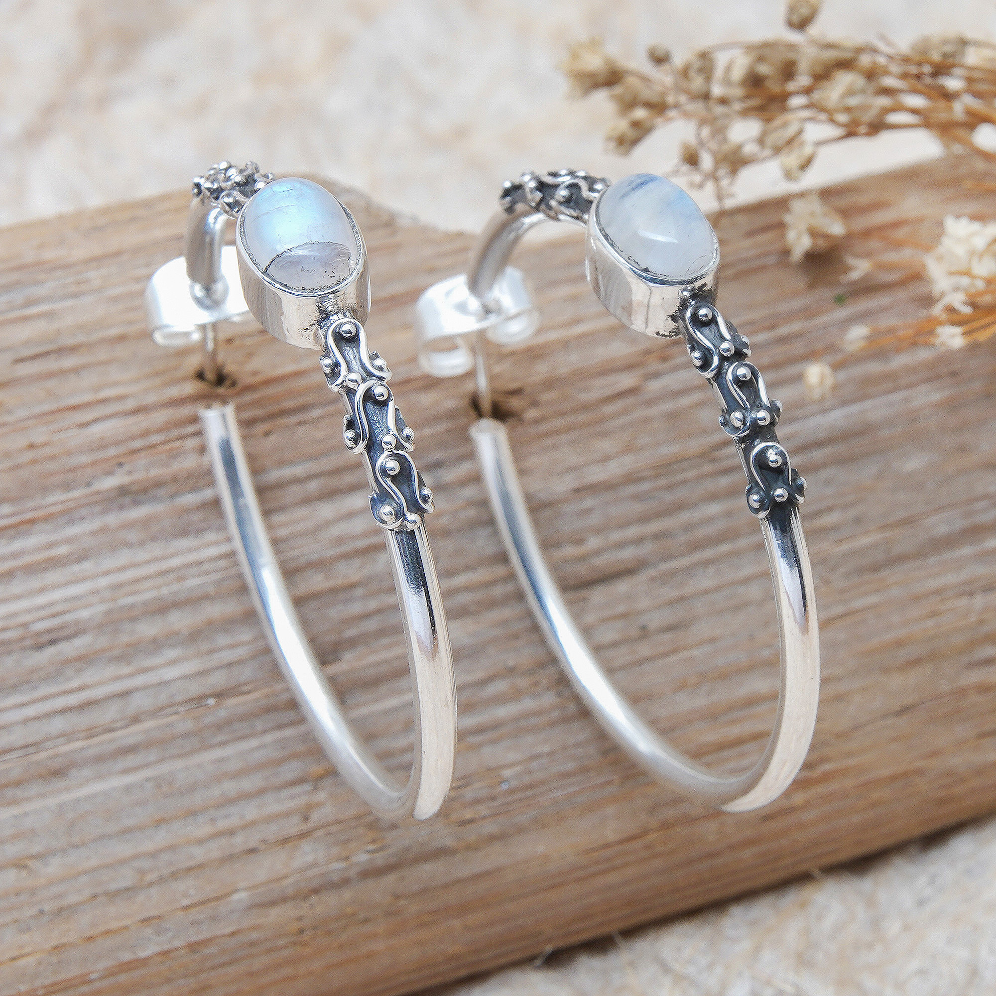 Balinese artisan Komang Suastra creates two half-hoop earrings of sterling silver, elaborating them with elegant wire and dot work that he performs by hand. Set in each earring is a natural rainbow moonstone.