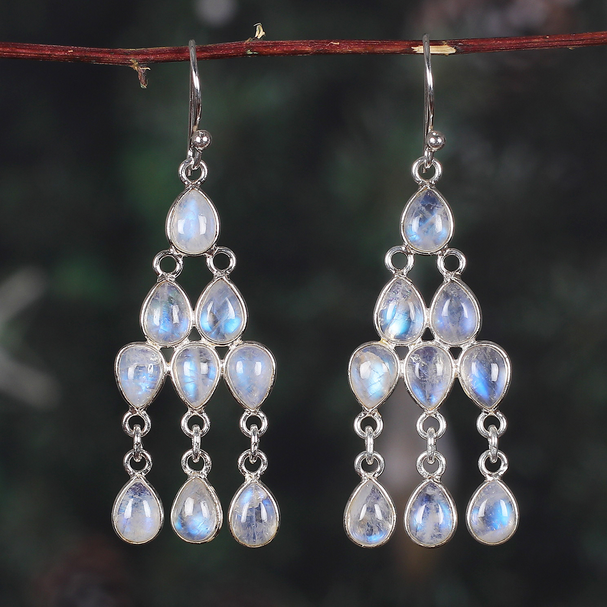 Rainbow Moonstone Silver Chandelier Earrings from India, 'Iridescent Cascade'