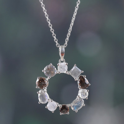 Rainbow Moonstone Smoky Quartz Labradorite Pendant Necklace, 'Posh Wreath of Gems'