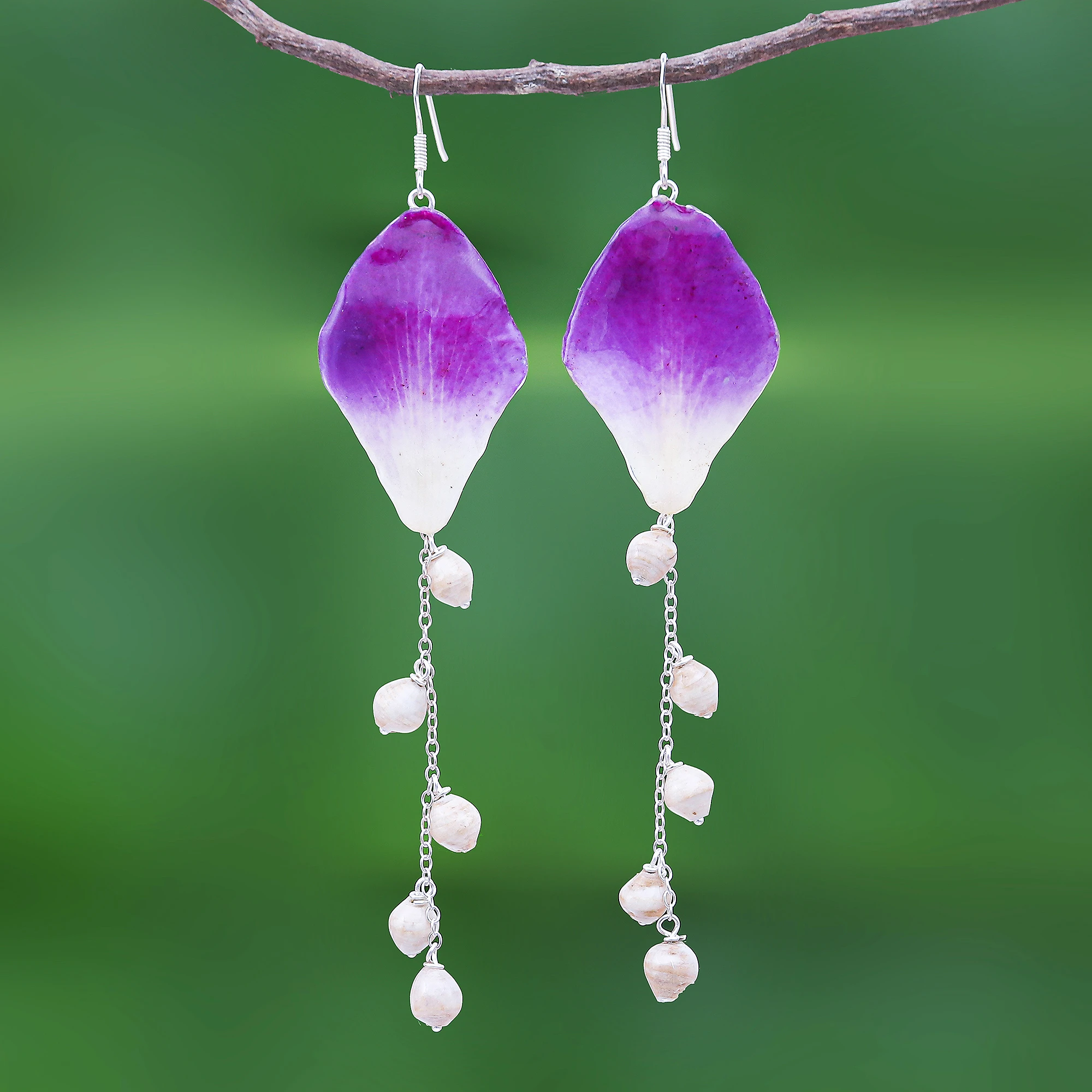 Working with natural flowers, artisans craft these pretty earrings, presented by Danai in Thailand. The purple and white petals are from actual dendrobium orchids; their beauty is preserved forever in a coating of resin. Pearl-like beads dangling beneath the petals are made from eco-friendly paper that is crafted from cleaning and dyeing elephant dung fiber. The long earrings swing from sterling silver hooks. Please expect the color and size of flower petals to vary.