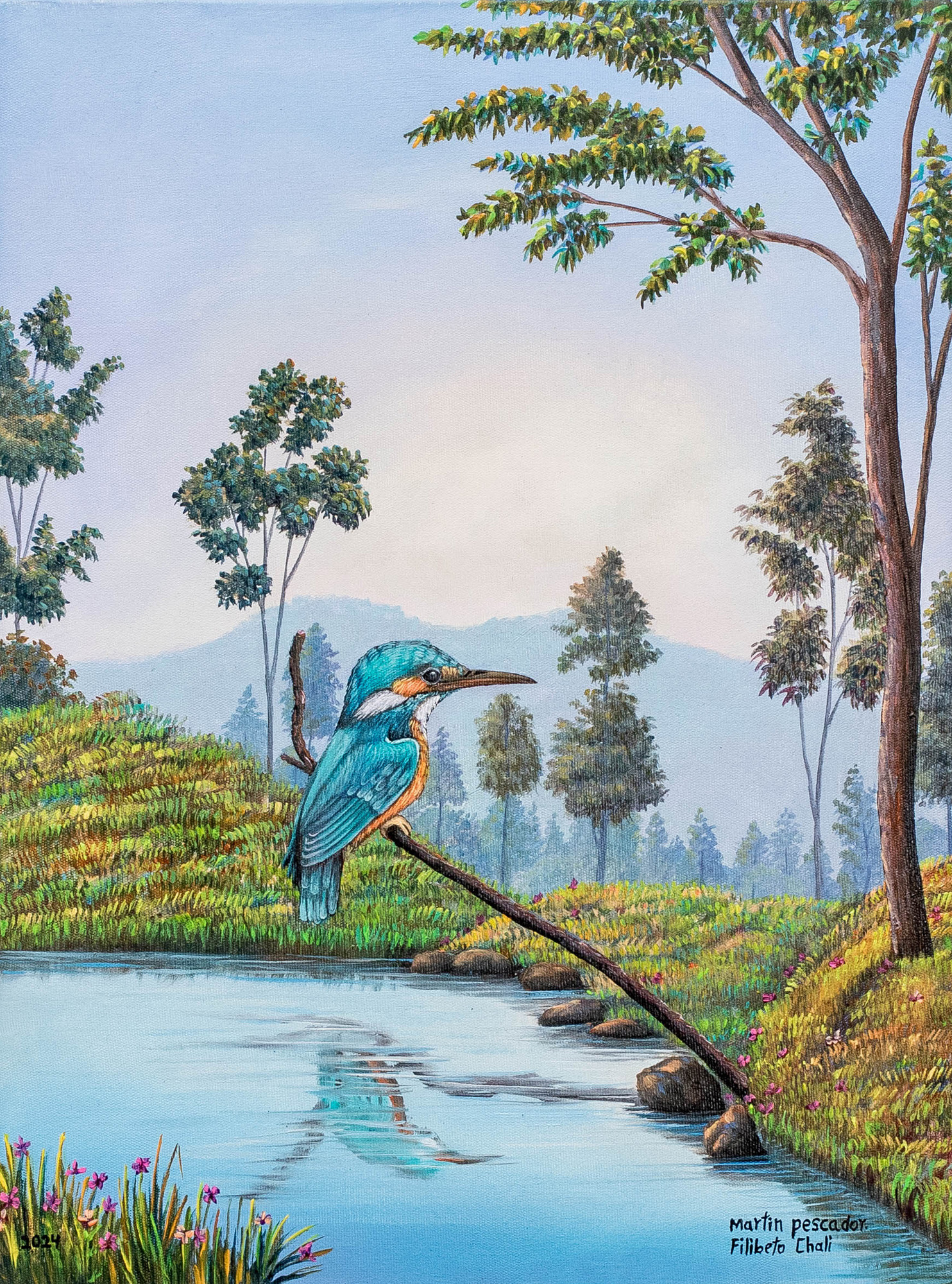 In this breathtaking oil painting, Filiberto Chali invites you into a world where a pristine, crystalline lake shimmers under a canopy of verdant trees and abundant greenery. Your eye will be drawn to the exquisite silhouette of an exotic Kingfisher, a vibrant jewel against the natural backdrop. The Guatemalan artist works with a brilliant palette where an interplay of bold blues, lush greens, earthy browns, fiery oranges, crisp whites and deep blacks brings every element to vivid life.