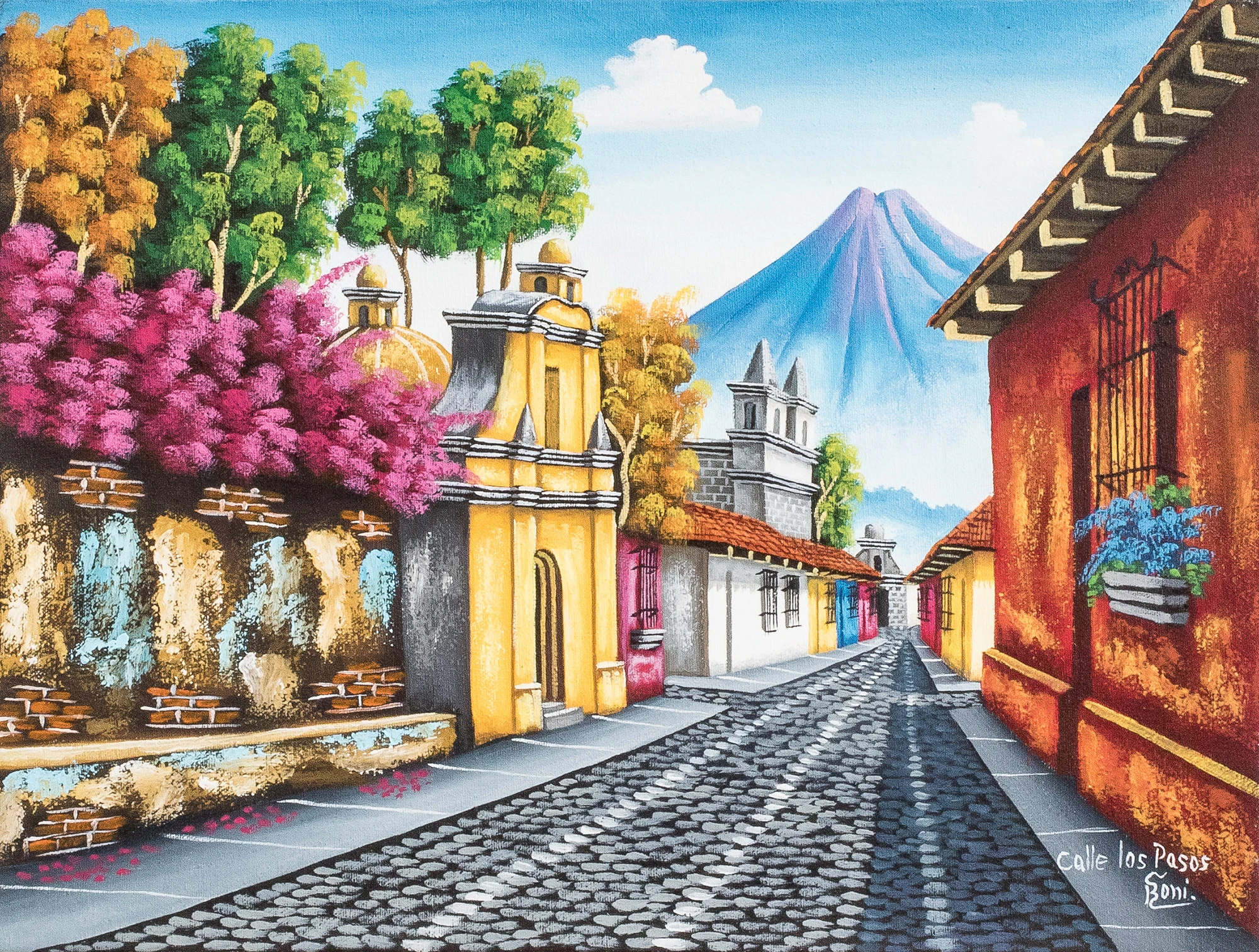 The Volcan de Agua rises above the picturesque town of Antigua, standing watch over a cobblestone street. Bonifacio Maxia Cutzal depicts the Calle de los Pasos, and the bell tower of the School of Christ Church. "I like this street because of its many chapels, a total of 12," the Guatemalan artist confides. "Antigua is a town of vivid colors. I enjoy walking with my children in this colonial city."
