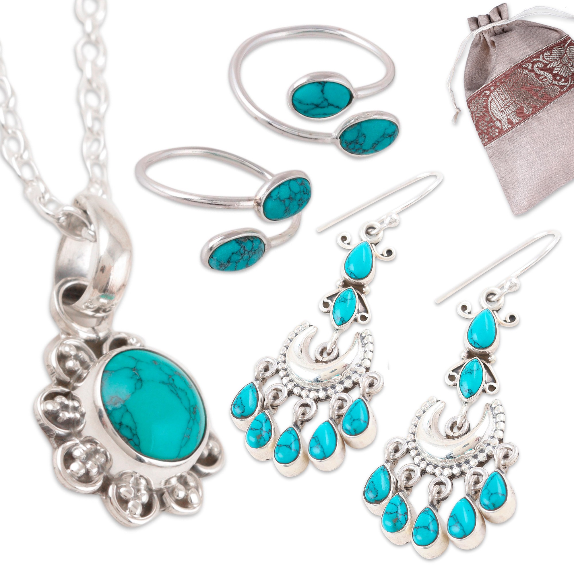 The Indian region teams with NOVICA to present a graceful example of its traditional jewelry arts. Alok Jain and Bhavya Jain unite their designs to create this exquisite curated gift set, which includes majestic chandelier earrings, sophisticated toe rings and a charming floral pendant necklace, all featuring advanced silversmithing and precious reconstituted and composite turquoise jewels exuding an ethereal aura.