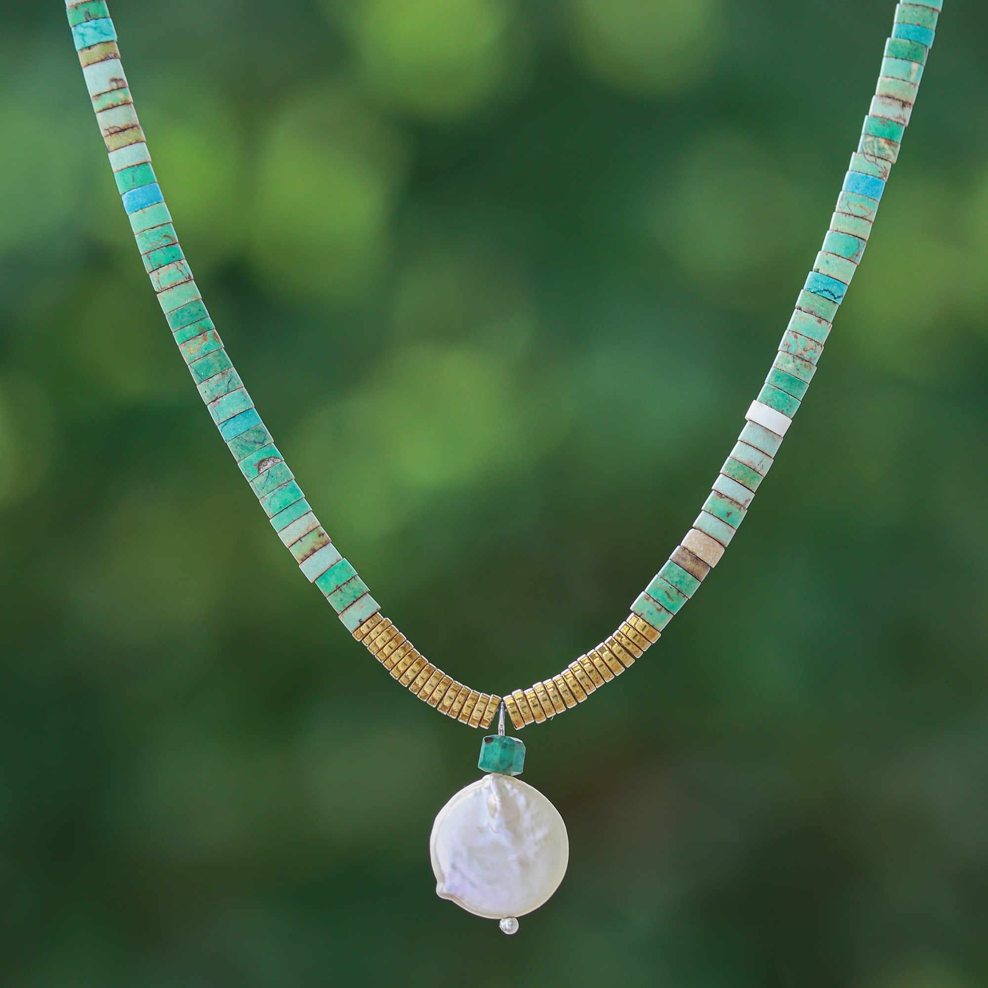 Serene like a lagoon, this beaded necklace reunites harmonious colors for a stylish look. Thailand's Somluck Komolmith uses reconstituted turquoise and hematite jewels to create this bohemian necklace, accented with a cultured pearl pendant in a natural white tone—shining with the moon's charm.