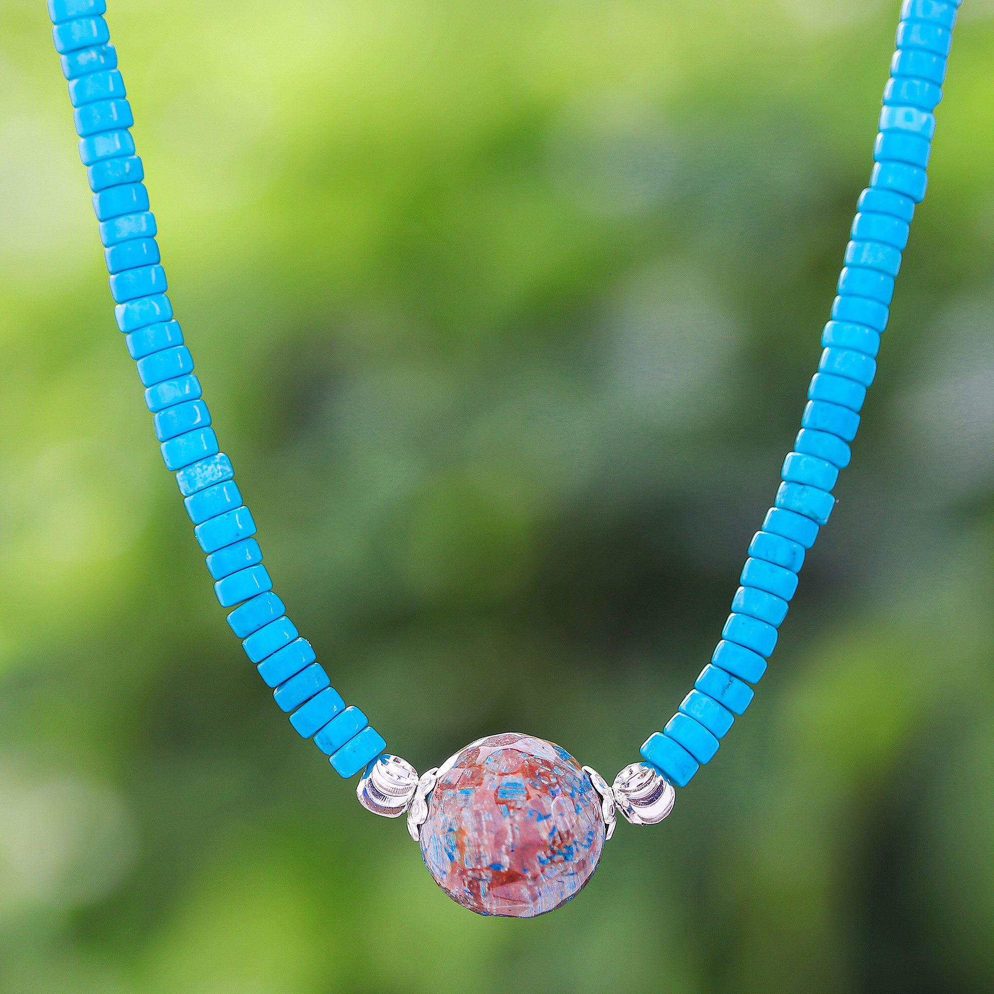Designed and crafted by Thailand's Somluck Komolmith, this beautiful beaded necklace features a single bead of blue-brown agate as a pendant. Round, flat reconstituted turquoise beads make up the balance of the necklace, which also includes sterling silver beads and tiny quartz beads near the adjustable clasp.