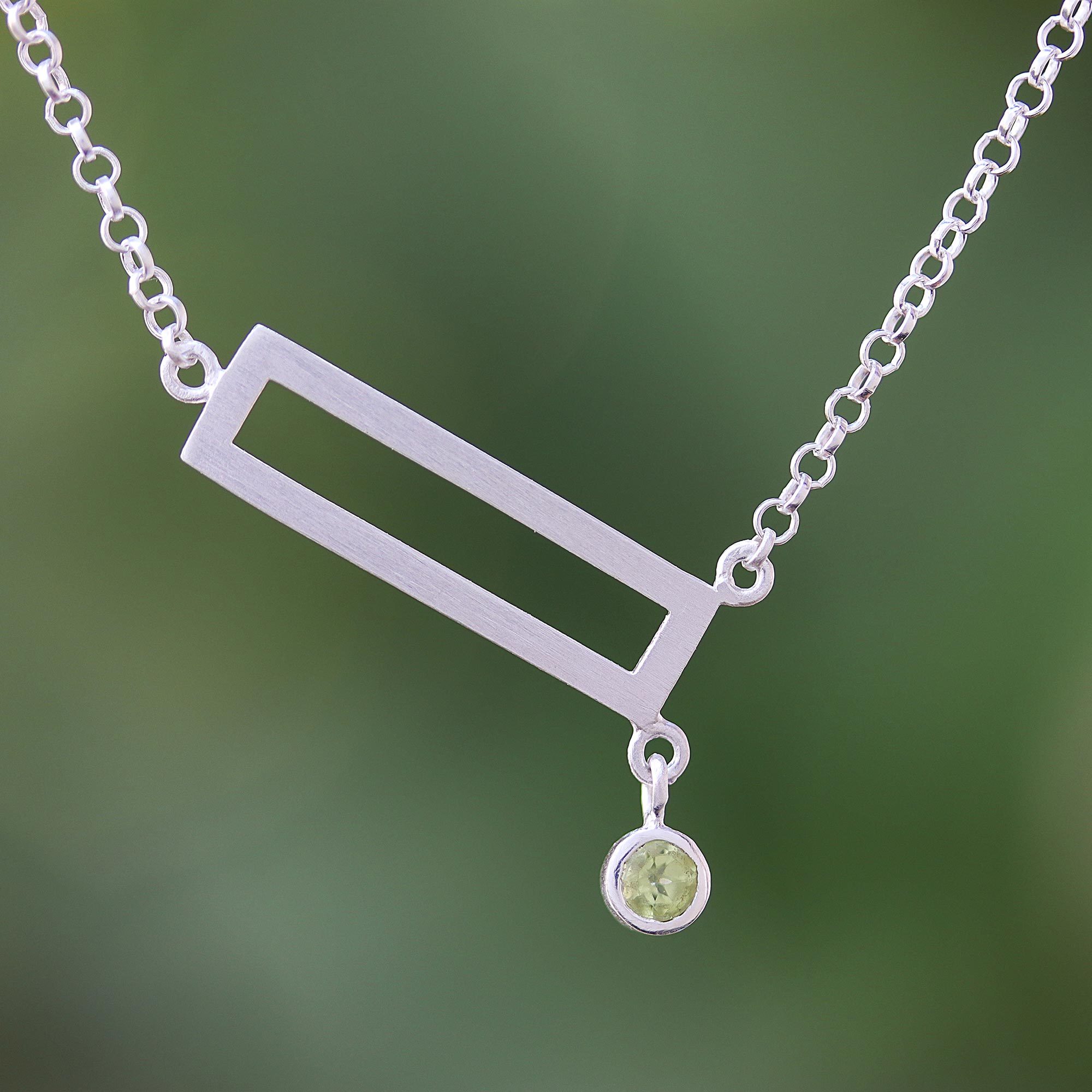 Crafted of sterling silver, a rectangle with a brushed satin finish centers this pendant necklace from Thailand. Jantana designs this necklace, featuring a dangling faceted peridot gem that dangles.