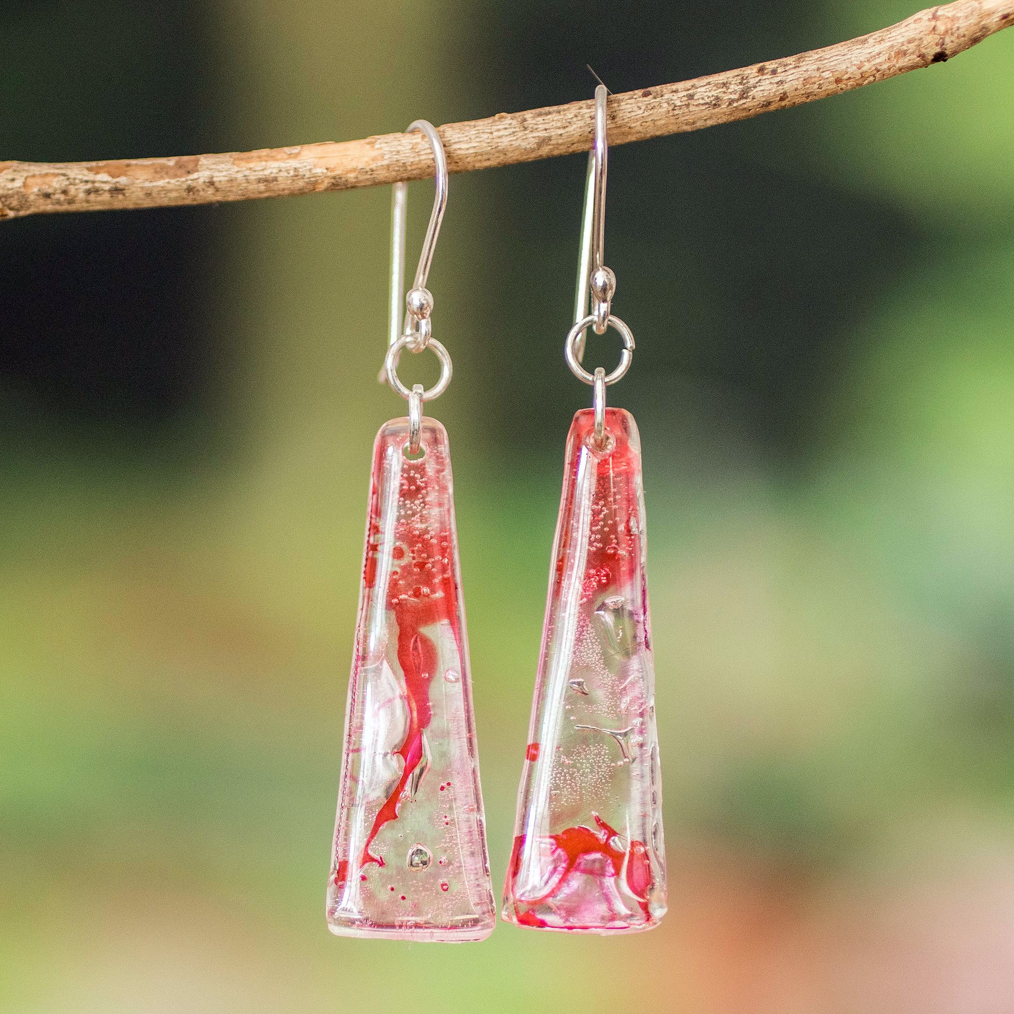 Rosario Leiva in Guatemala achieves an extraordinary effect with the design of these earrings. Inspired by ecological concerns, she recycles CDs and treats them with acrylic stained glass--the result are unique and original earrings in shades of pink and red, underscored by contrasting textures. The earrings are worn on sterling silver hooks.