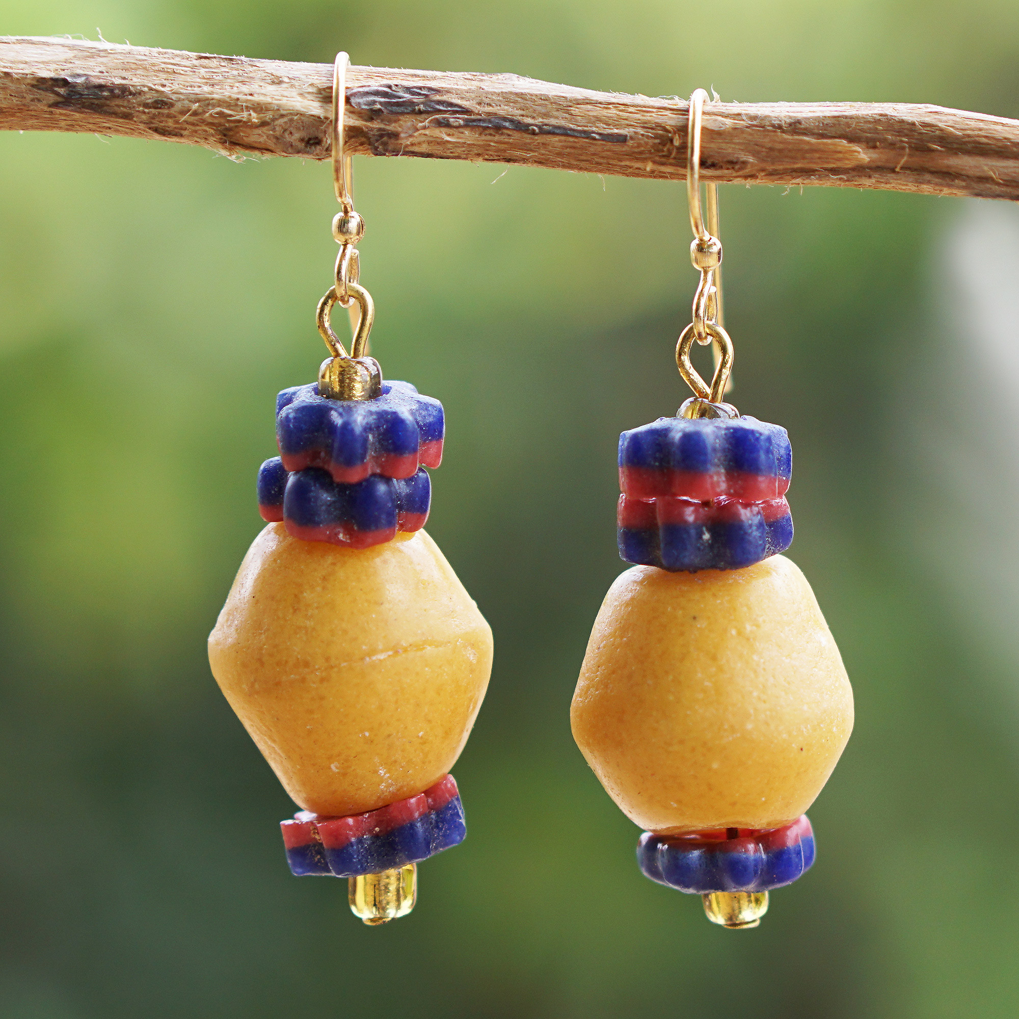 Recycled glass beads in maize, red and blue come together for this pair of dangle earrings that will look stunning with just about any outfit. The fabulous earrings feature brass hooks and artist Mary Dzidzienyo calls them Amivi, a word in the Ghanaian Ewe language commonly used to refer to women who were born on a Saturday.