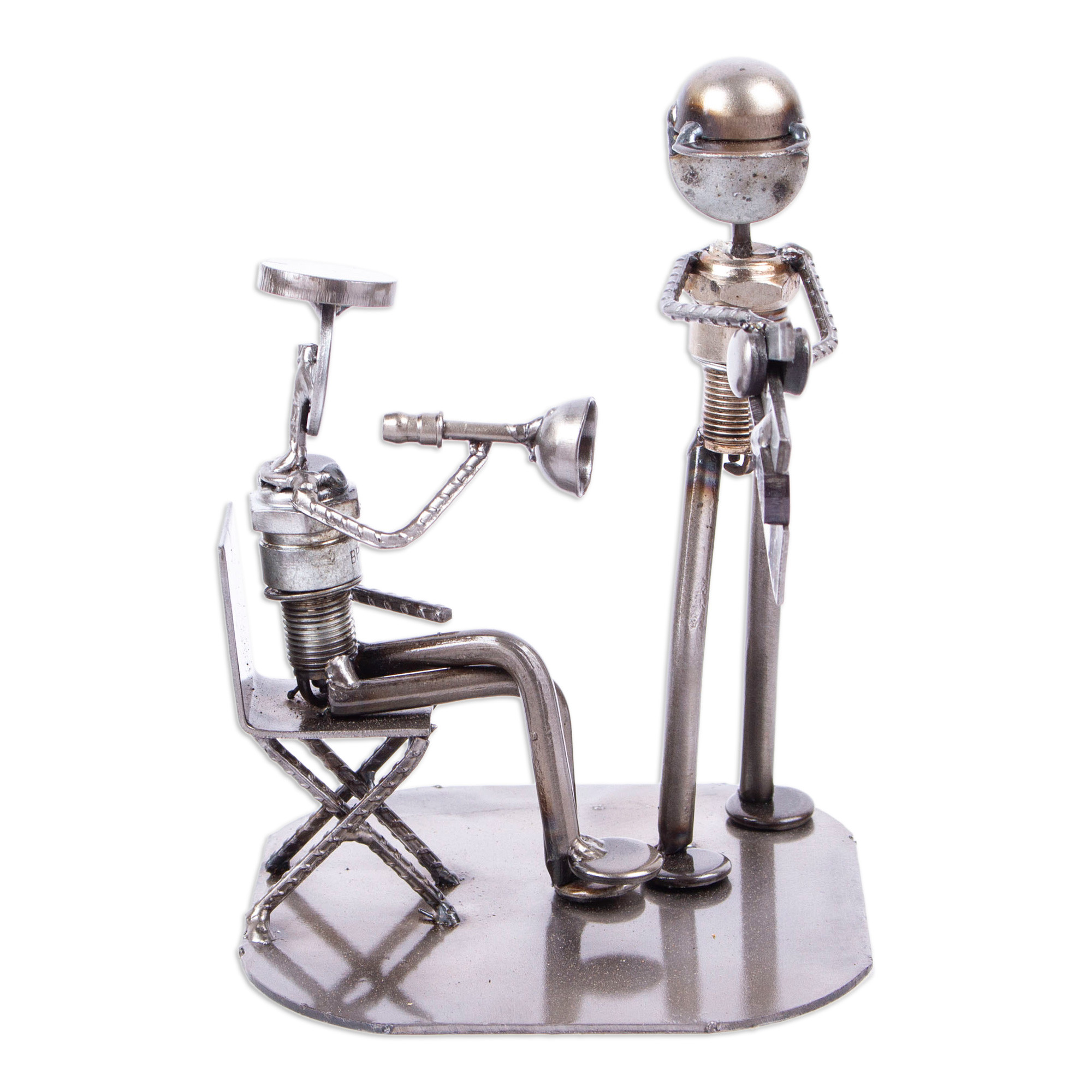 "Action!" Seated, a movie director calls instructions with a bullhorn while his assistant operates the film slate. Armando Ramirez resurrects discarded auto parts and metal, giving them a new purpose as art. Spark plug bodies, galvanized wire, die-cut scraps and screws all ingeniously fulfill distinct roles in this original sculpture.