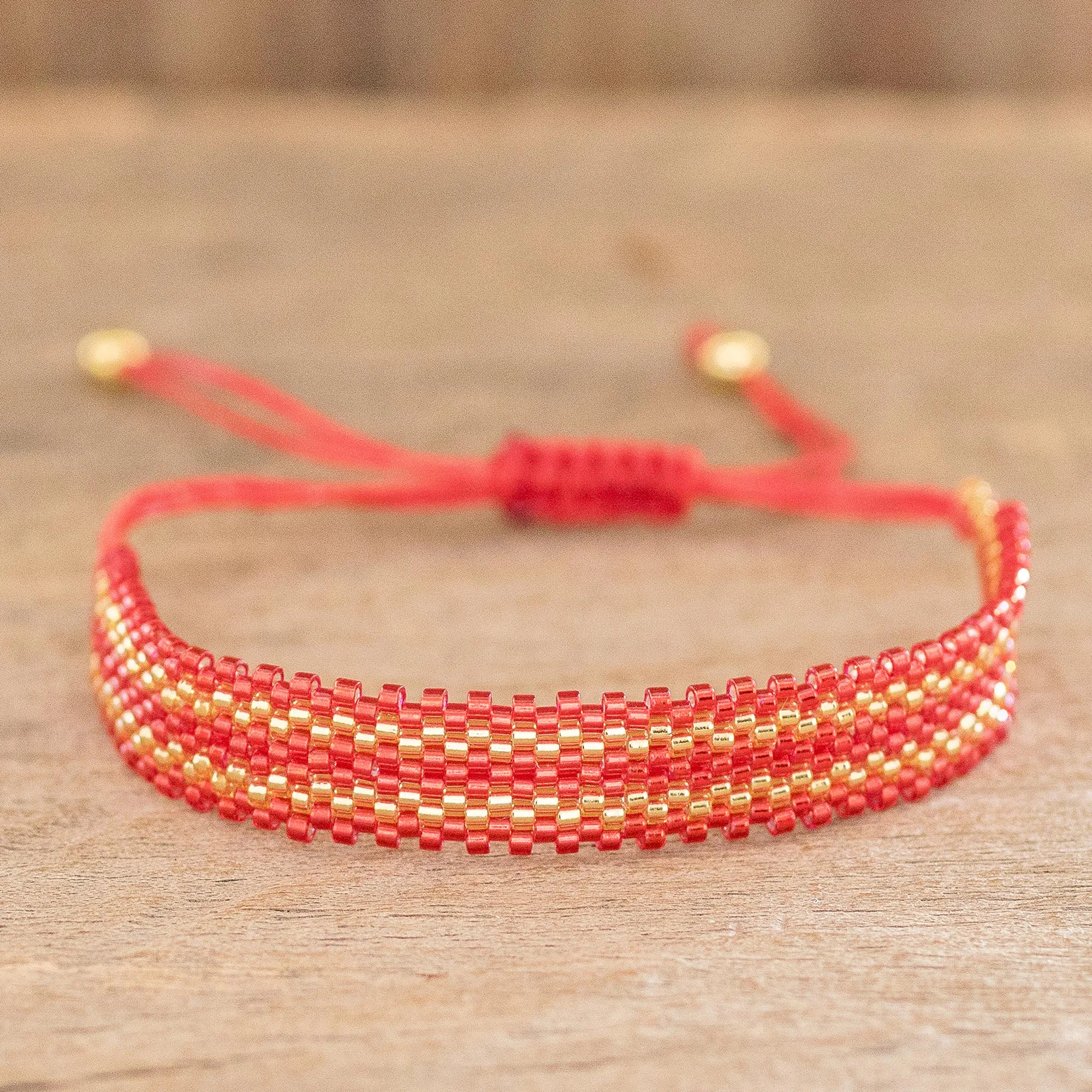 Red and gold are a bold combination in this stylish wristband bracelet from Guisselle Mora in Costa Rica. The artisan knots nylon cords with tiny glass beads to create the bracelet, which features a sliding knot for adjustable length. Polished 14k gold filled beads accent the cord ends.