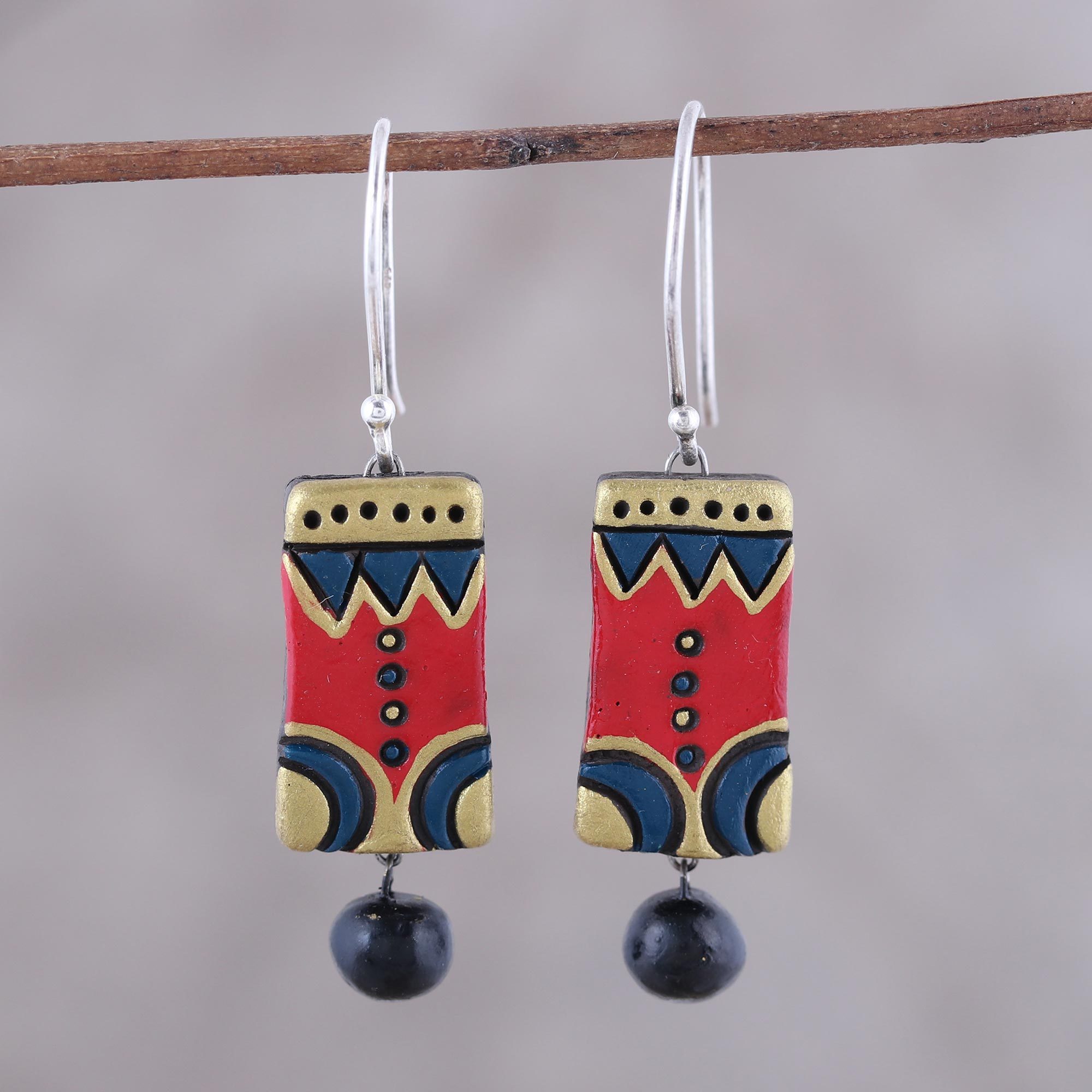 Singing a sweet sonata, these Bollywood-style dangle earrings are designed by Ritu Thapar in India. Each earring is handcrafted of ceramic, featuring a hand-painted finish in red, blue, and gold tones. These earrings swing from sterling silver hooks.