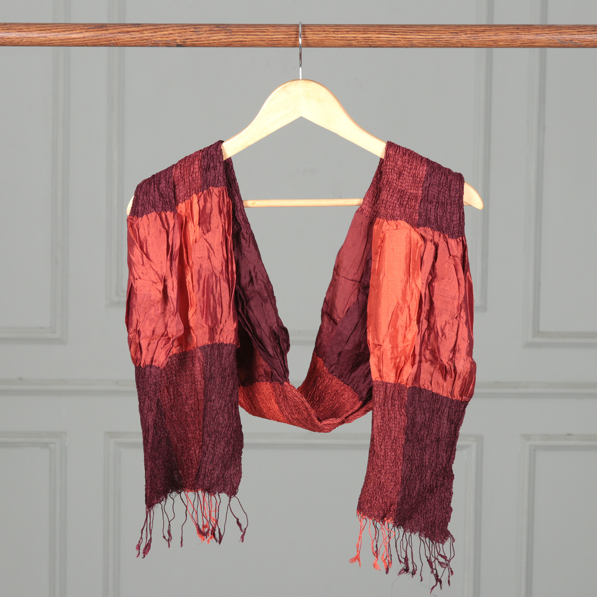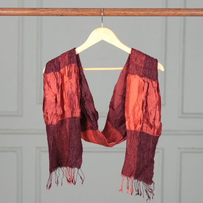 Red Brown Black Checkerboard Ruffled Patchwork Silk Scarf, 'Mystique Russet'