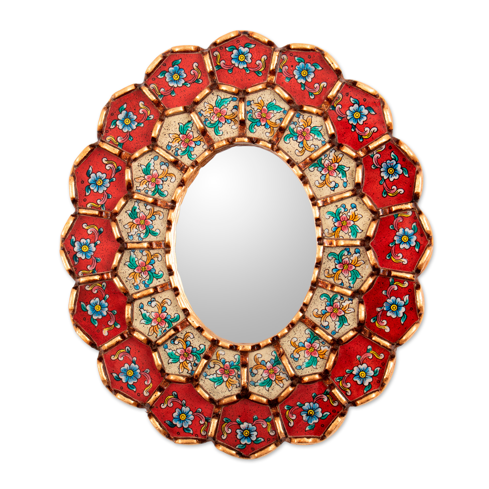 Red Floral Bronze-Gilded Reverse-Painted Glass Wall Mirror, 'Flowery Arrangement'