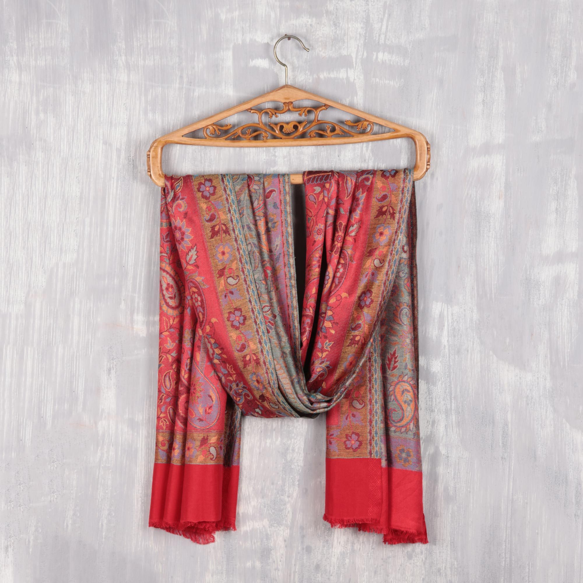 Red Jamawar Style Paisley and Floral Shawl, 'Paisley Extravagance'