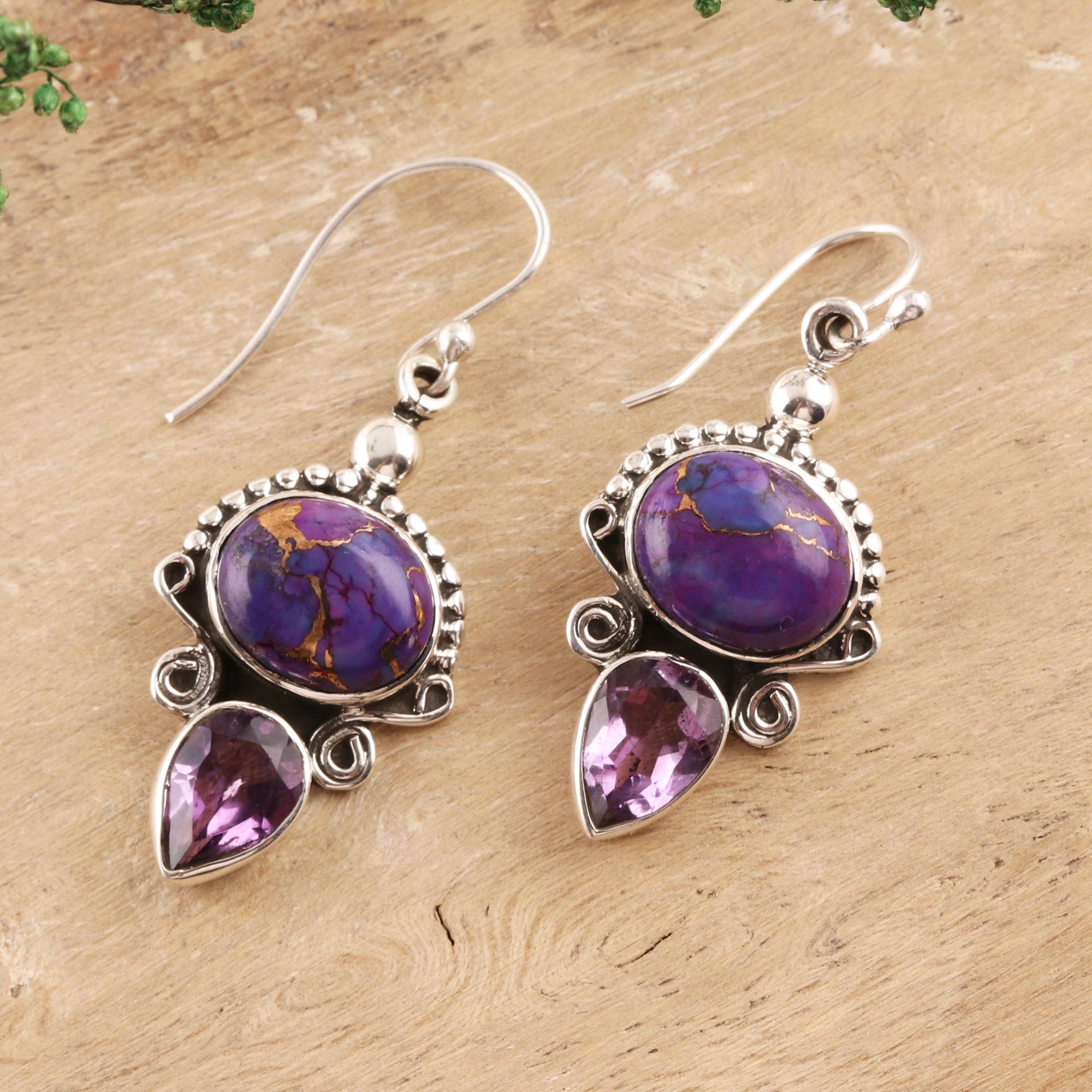 Possessing a regal beauty, two cabochons of composite turquoise feature intriguing purple hues. Designer Neeru Goel showcases the oval stones in sterling silver earrings. Beneath, teardrops of faceted amethyst total three carats.