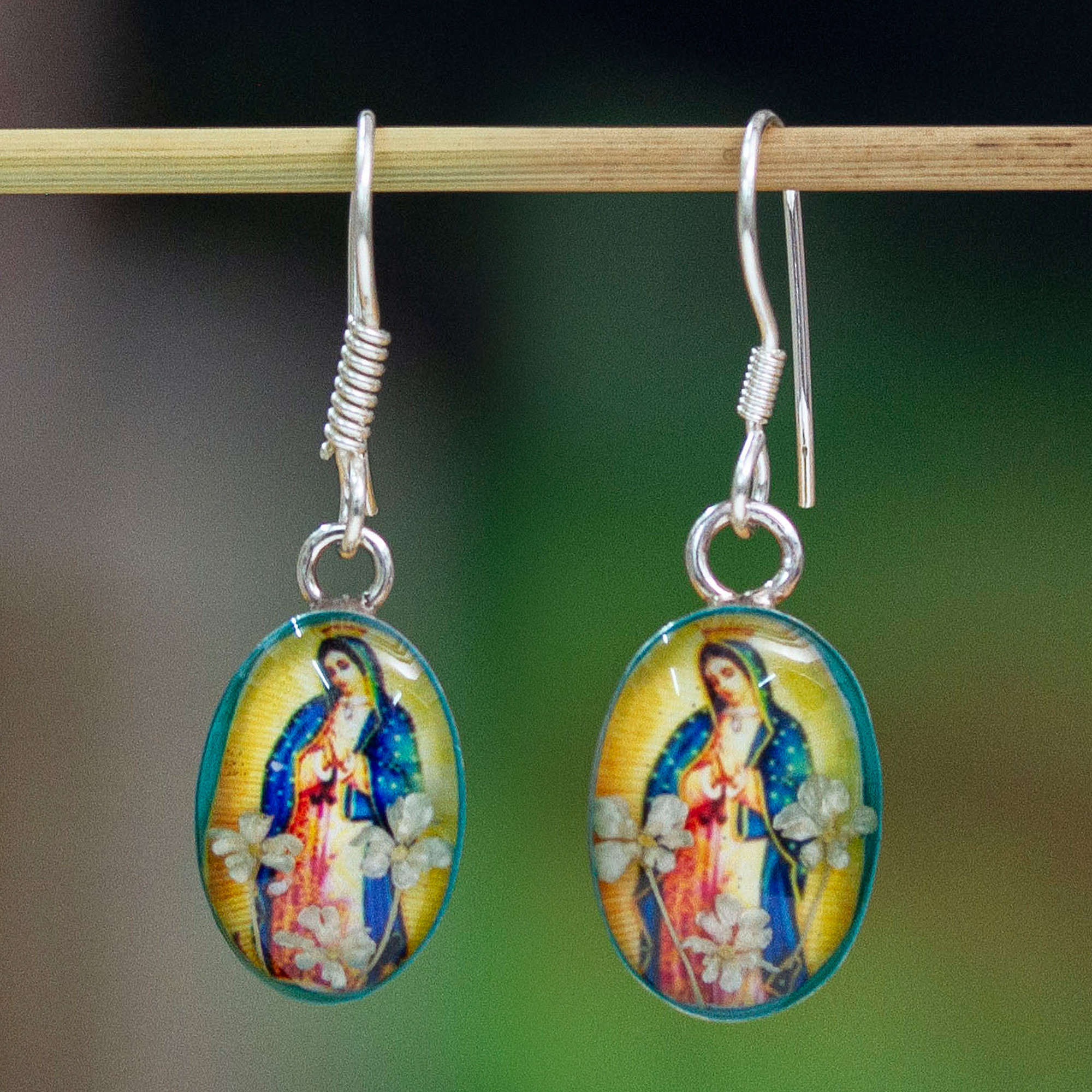 The image of the Virgen de Guadalupe, or Mother Mary from the Christian religion, is featured in two oval dangle earrings. In each earring, she is flanked by petite natural flowers captured in resin, adding color. Adorning the ears on hooks of sterling silver, this striking accessory makes an excellent religious companion.