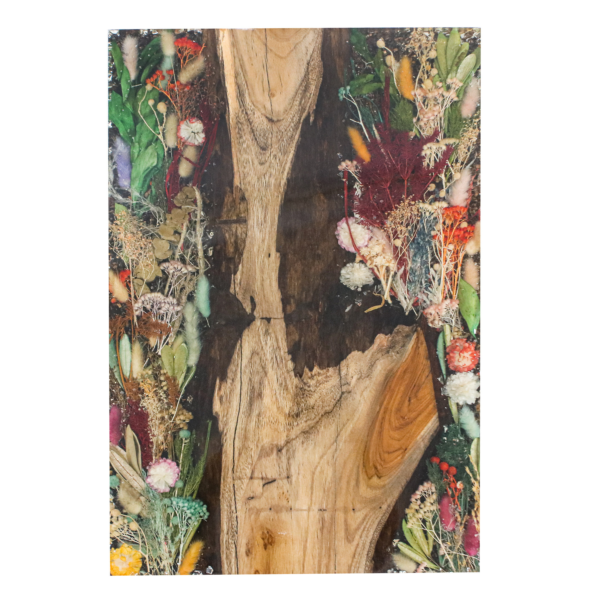 A scene from a wild spring is immortalized by Thai artisan Martin Halpin in this resin-coated wall art. Longan wood and natural flowers rest in this modern composition, which appears to capture the essence of the natural and the blooming season.