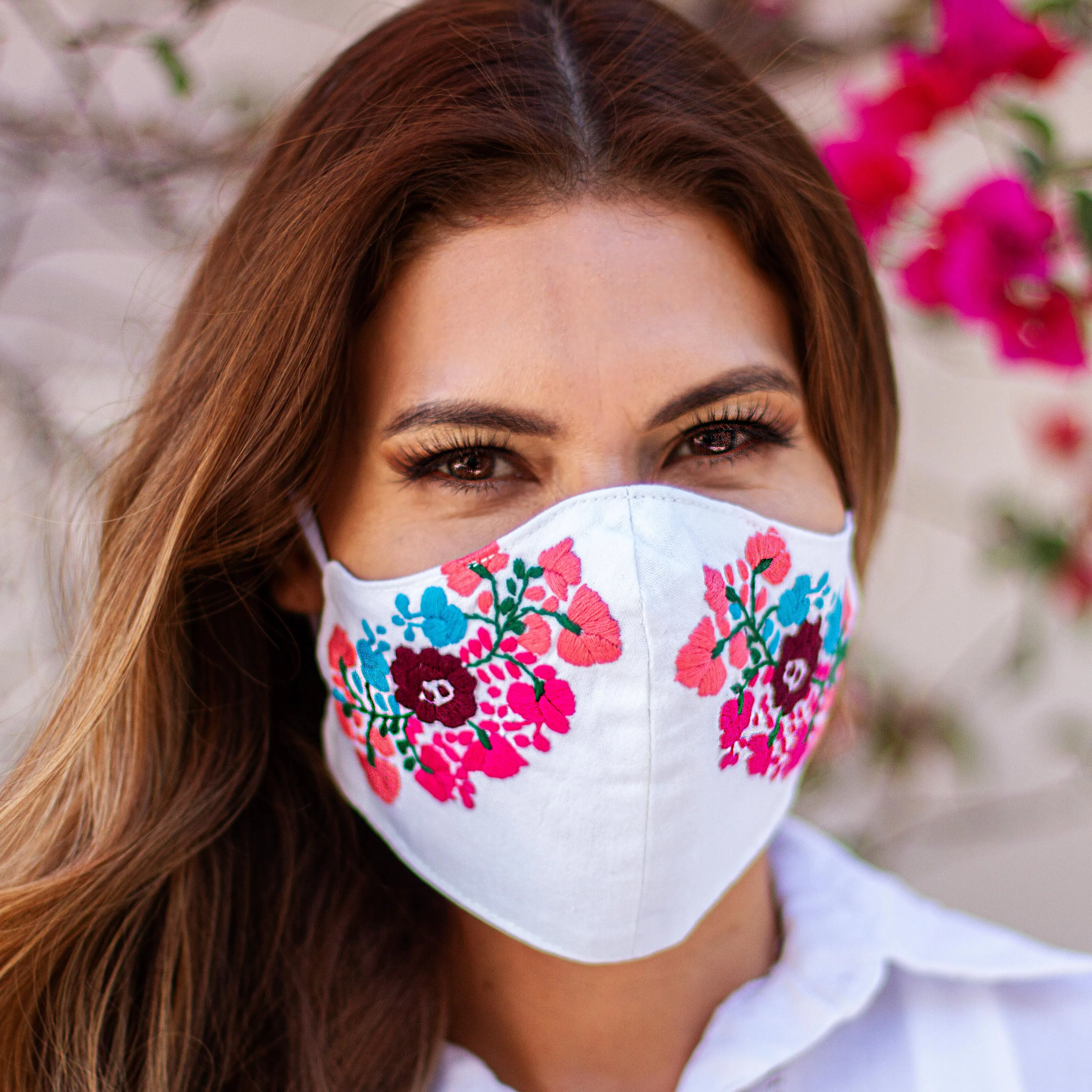 Protect yourself in style with this elegant face mask from Sierra Embroidery in Mexico. The double-layered white cotton mask features floral hand embroidery in strawberry red, pink and green. It is contoured for comfort and features elastics to loop over the ears.