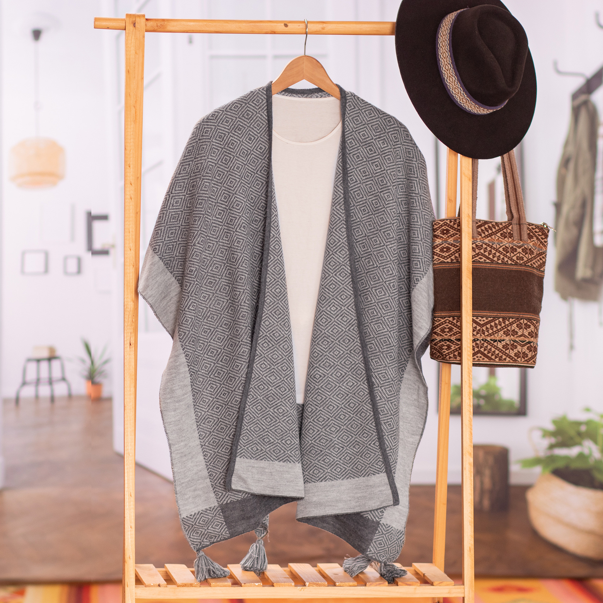 Enjoy wrapping up in this cozy, warm ruana by Peruvian artisan Waldo Berrios. Knit from a soft alpaca wool blend, the reversible ruana features a diamond pattern in graphite and off-white and tassels on the corners for a decorative touch.