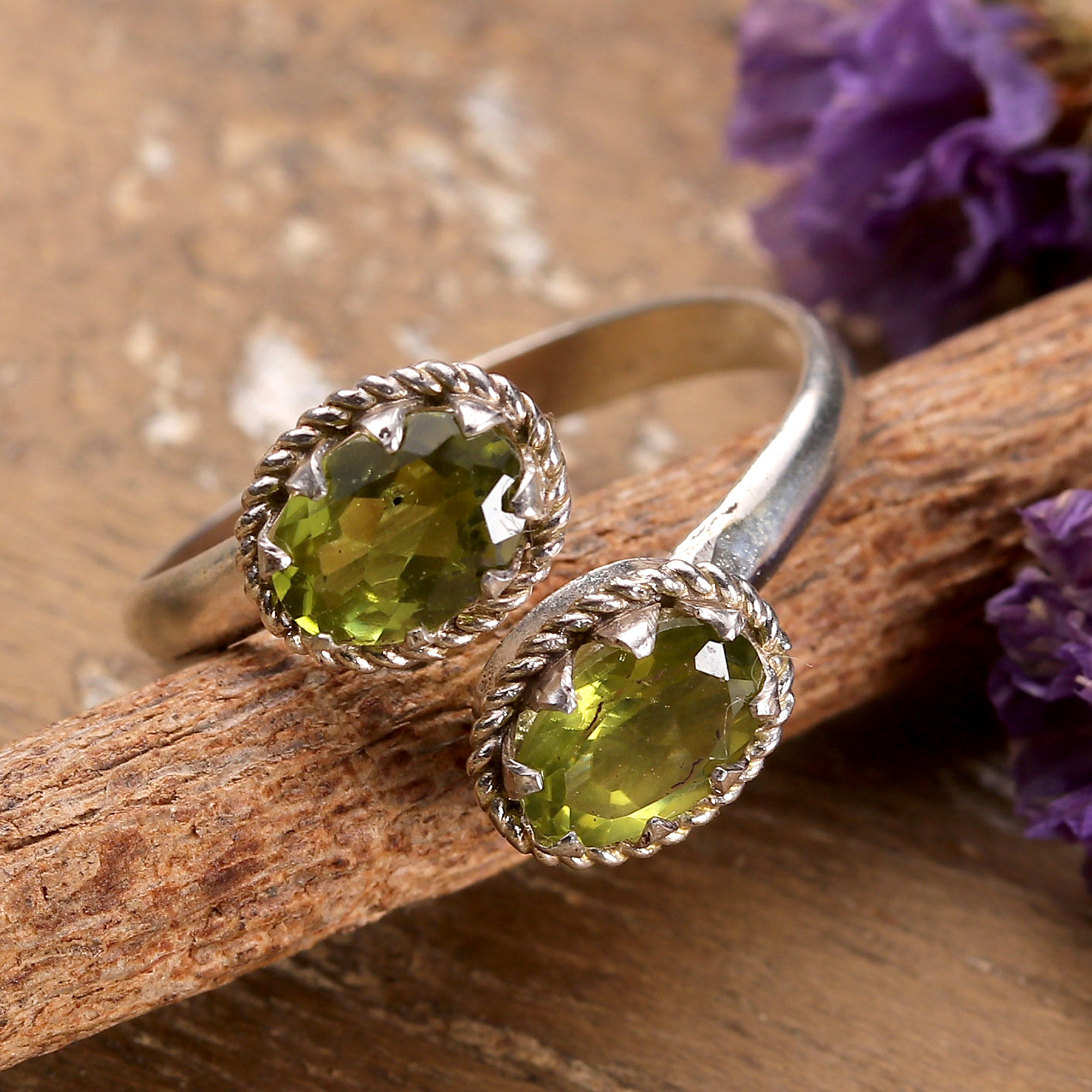 Three carats of natural peridot gemstones are featured at the front of this Indian ring, wrapping the finger with a simple band of sterling silver bathed in rhodium. Alok Jain presents the ring, inspired by his passion for jewelry since his teenage years.