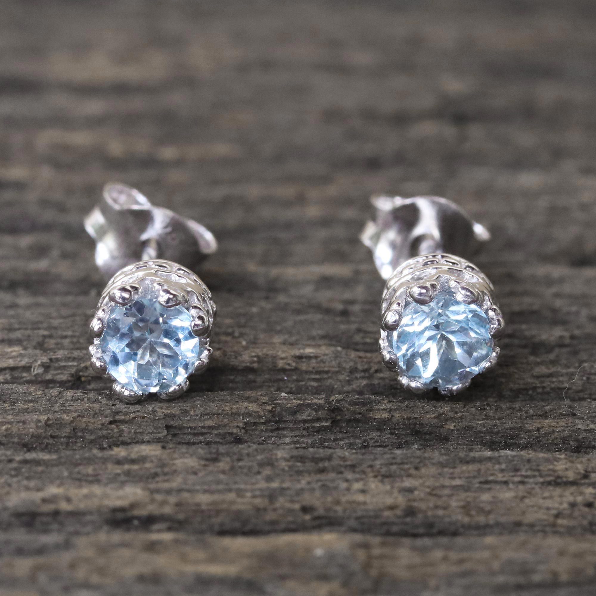 Brilliant blue topaz stones glisten within crowns crafted from rhodium-plated sterling silver. Artisan Michael Krainer of Thailand works with his family to design these radiant stud earrings.