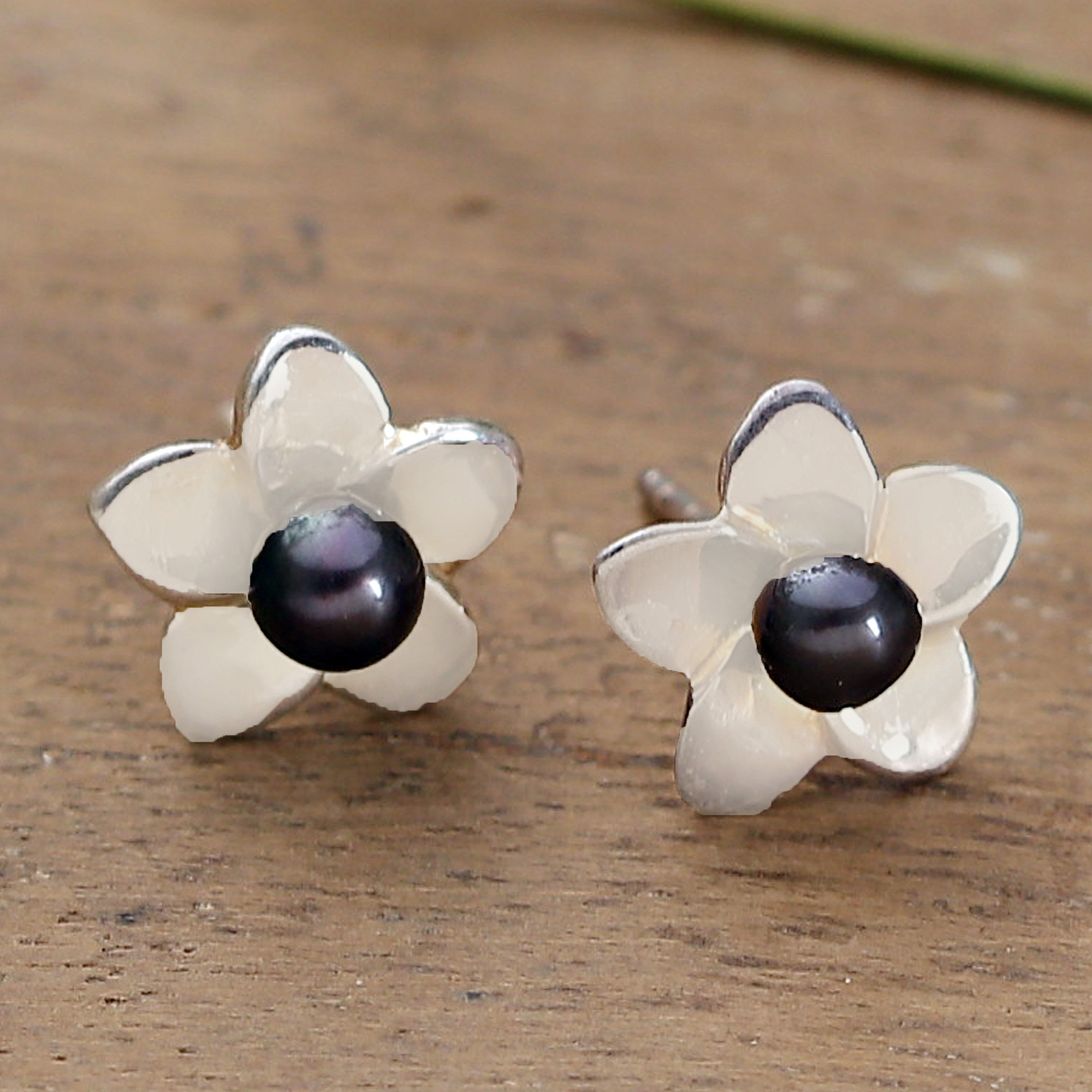 The glorious bloom of jasmine awakens to the magnificent hue of a pair of dark grey cultured pearls—a precious design presented by Alok Jain. India's best artisans use rhodium-plated sterling silver to create these flower-shaped button earrings, whose high-polished petals play with the pearls' puissant light.