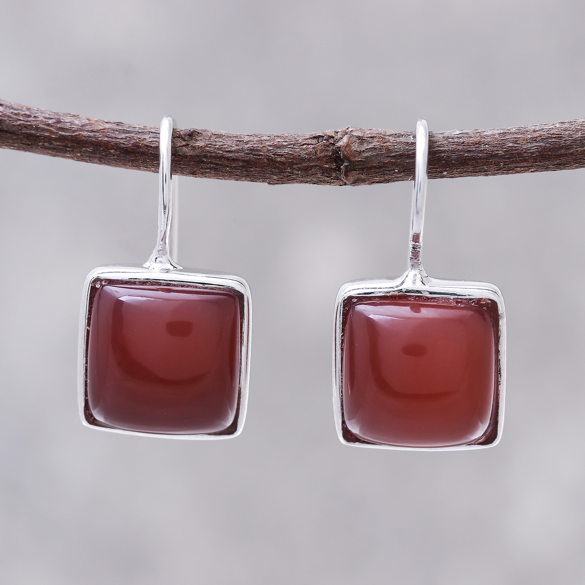 Gleaming with the red-orange hues of fire, two squares of natural carnelian are featured in this pair of drop earrings from Thailand. Michael Krainer sets the fascinating stones in settings of rhodium plated sterling silver.