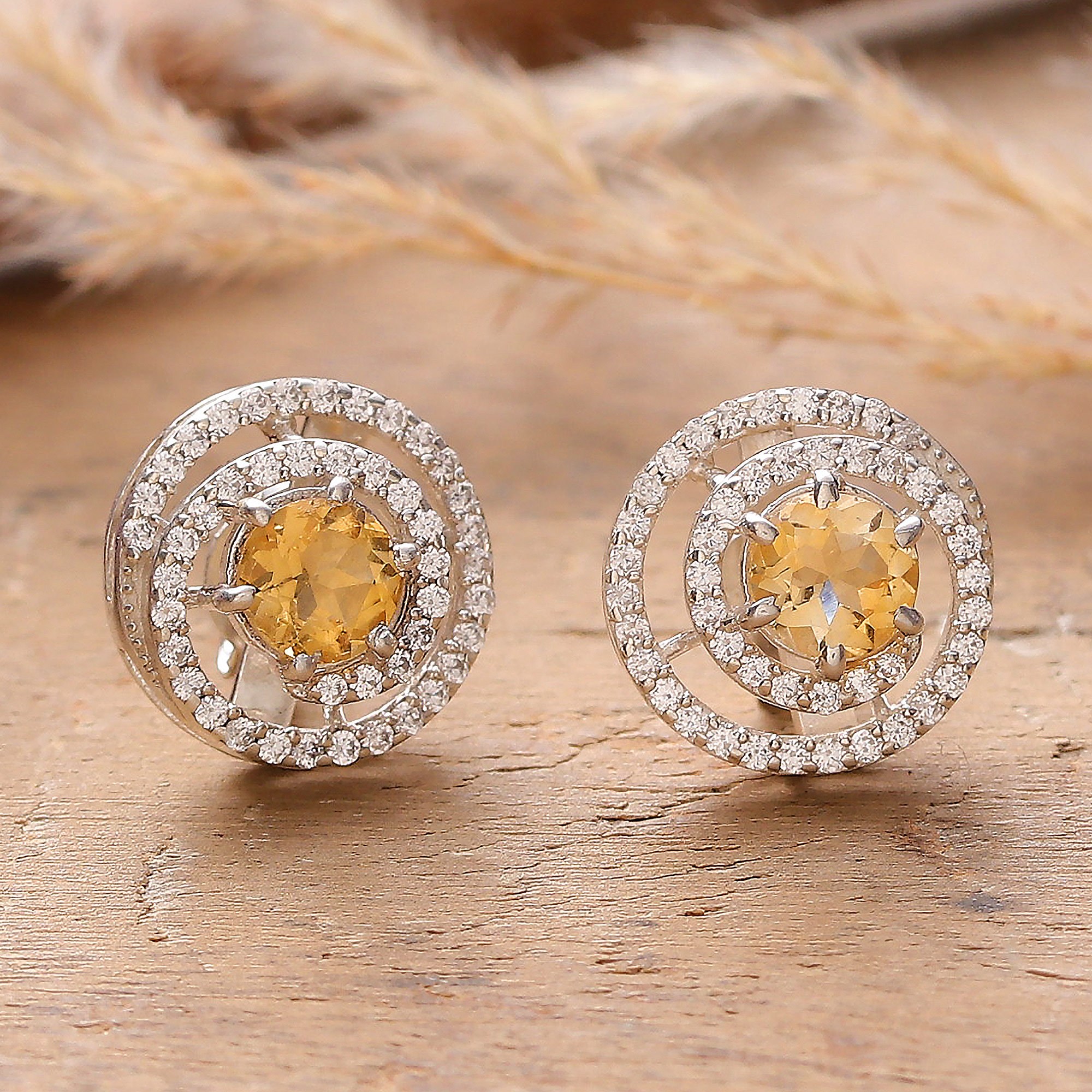 Citrine's natural warmth takes center stage in these sophisticated button earrings where the shimmering stones command attention against their brilliant rhodium-plated sterling silver settings. Each gem sits encircled by a constellation of cubic zirconia that catches and fractures light into tiny rainbows, creating a mesmerizing dance of sparkle around the earlobes. Indian artisan Bhavya Jain's sublime accessory brings subtle elegance to formal occasions that call for a touch of luxury.