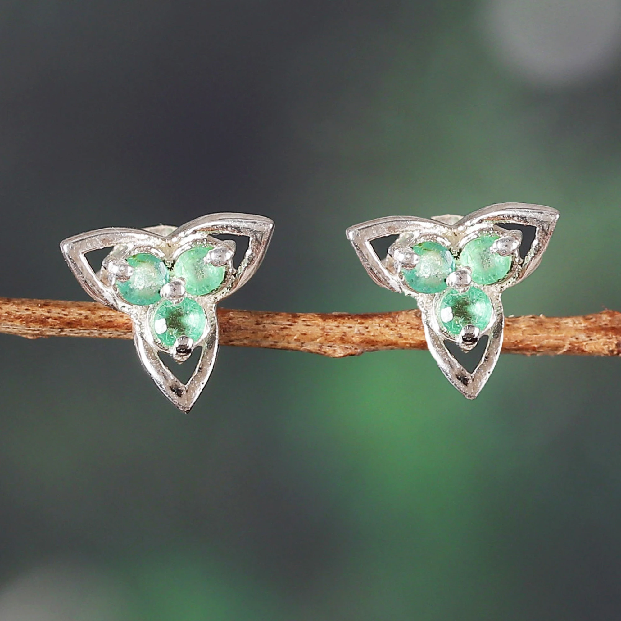These refined stud earrings showcase three delicately shaped petals of rhodium-plated sterling silver, each crowned with a vibrant emerald. The gemstones bring a rich splash of color to Indian artisan Bhavya Jain's sleek design, creating a refined accessory that effortlessly adds a touch of elegance to any outfit.