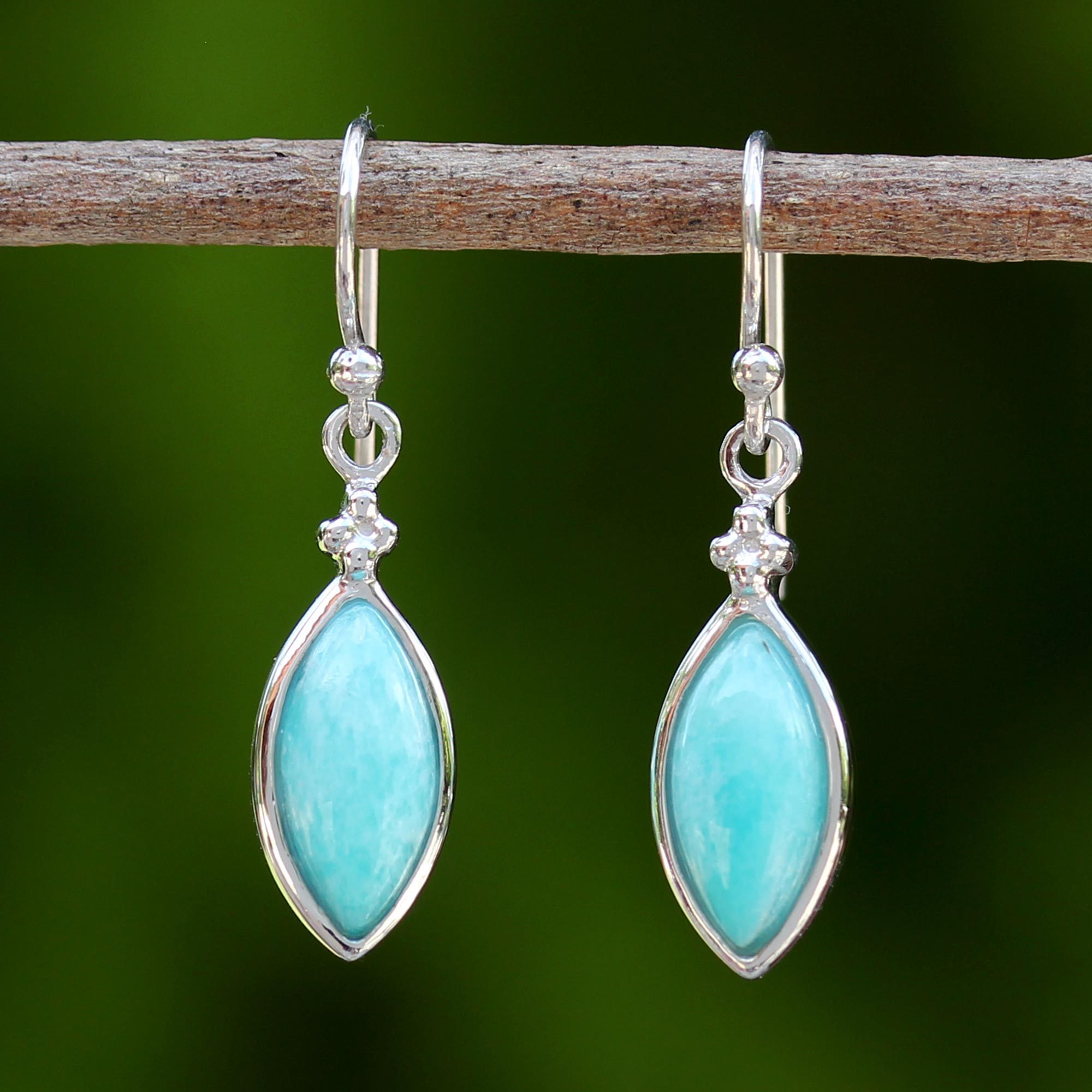 Knowing eyes dangle from the ears on hooks made from rhodium plated sterling silver, designed by Michael Krainer. Fitted with pieces of sky blue reconstituted turquoise, these dangle earrings from Thailand bring a striking beauty to the wearer.