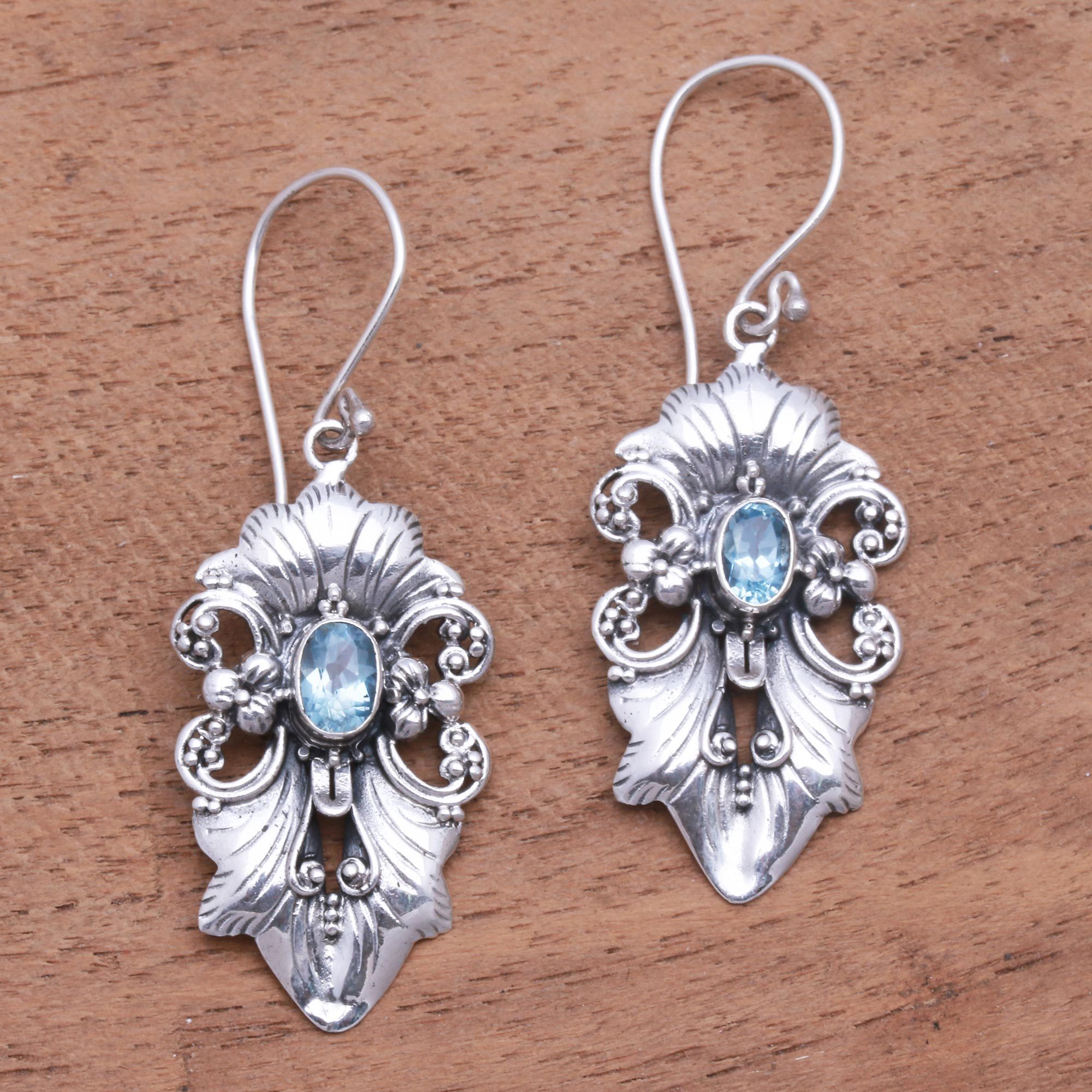 Resembling a regal crest, ribbon-like patterns in sterling silver frame two oval gemstones of blue topaz. Balinese artisan Giri Tasmana creates these dangle earrings.