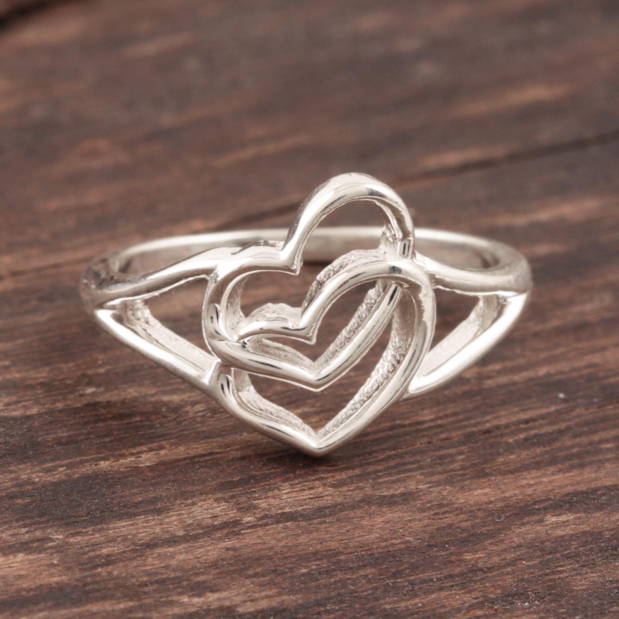 United in love, two interconnected hearts are crafted from high-polish sterling silver that glimmers in the light. India's Neetu Barathi designs this romantic band ring for the perfect way to say "I love you."