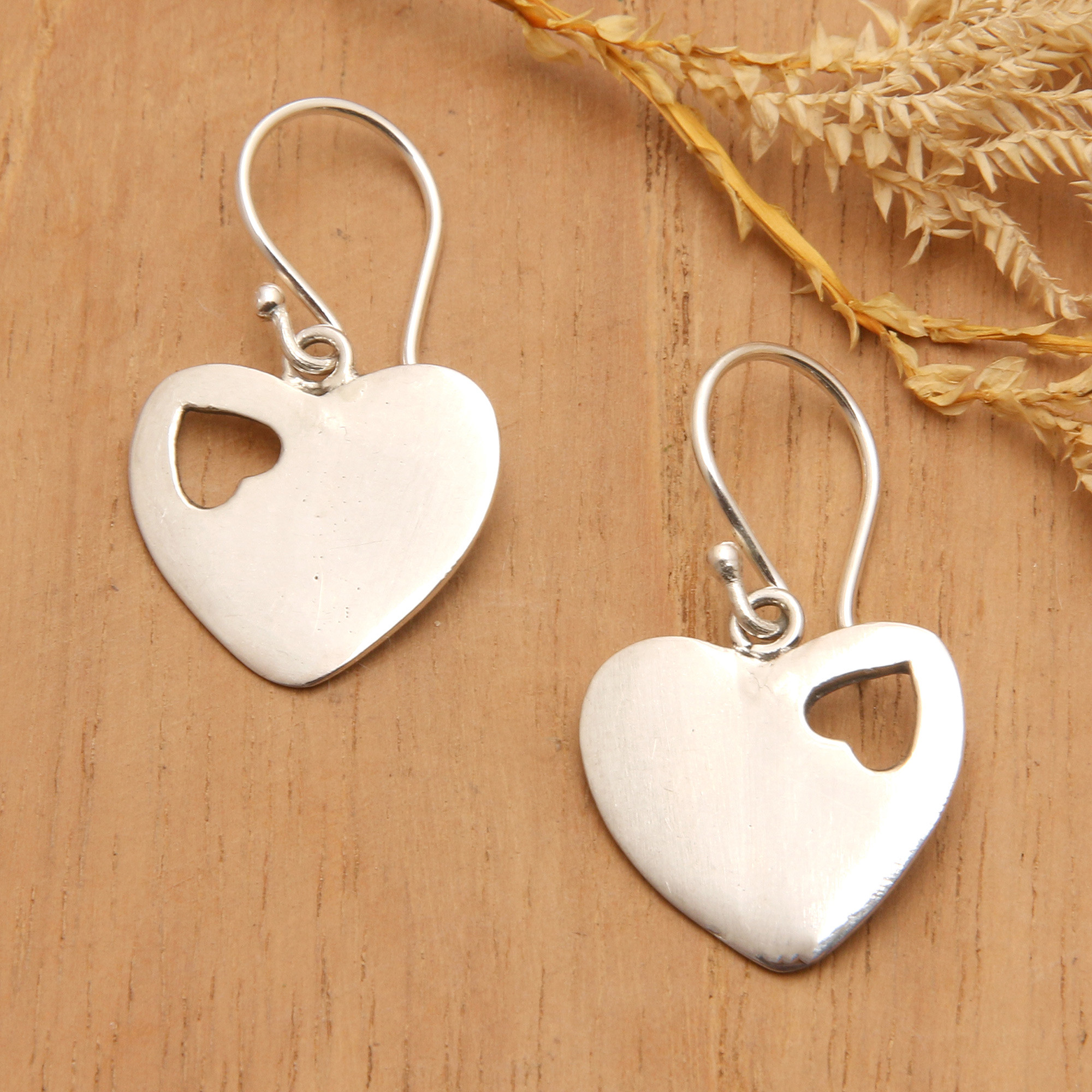 Thinking about romance? Griya Suarningsih's newest dangle earrings accompany you on those sweet and lovely thoughts. The Balinese artisan works with sterling silver to create these heart-shaped dangle earrings, whose high polish finish enriches the cute illusion that the inner heart silhouettes create in each piece.