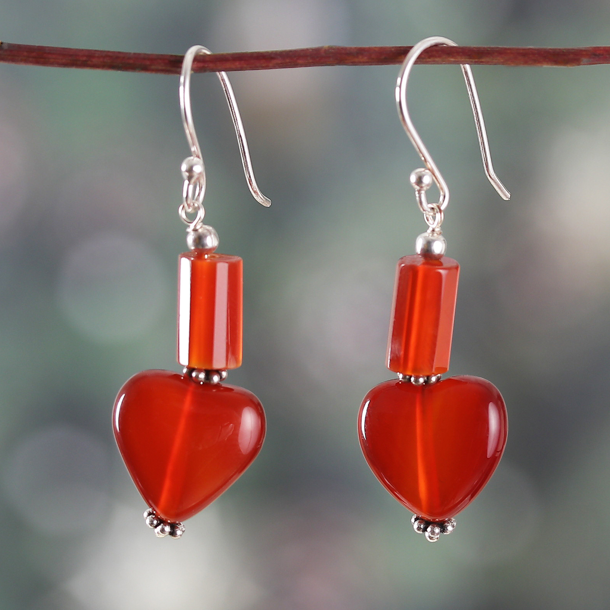 Infused with a modern touch, Narayannii's dangle earrings honor love as a bold sentiment. Crafted in India, this sterling silver pair showcases carnelian stones in chic geometric and heart-shaped beads, ideal for a unique fashion statement.