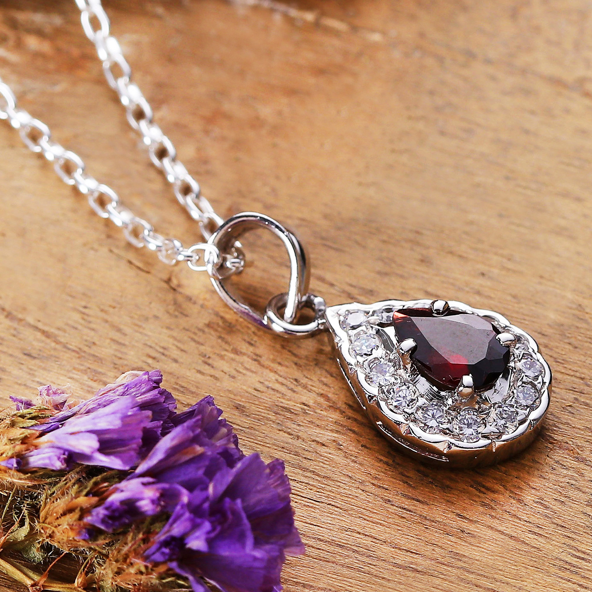 The tears of those in love are sweet and tender, like the crimson light emanating from Alok Jain's pendant necklace. Made by Indian jewelers, this rhodium-plated accessory decorates its high-polished sterling silver structure with gleaming cubic zirconia stones, each arranged around a natural drop-shaped garnet jewel—totaling one carat of pure passion.