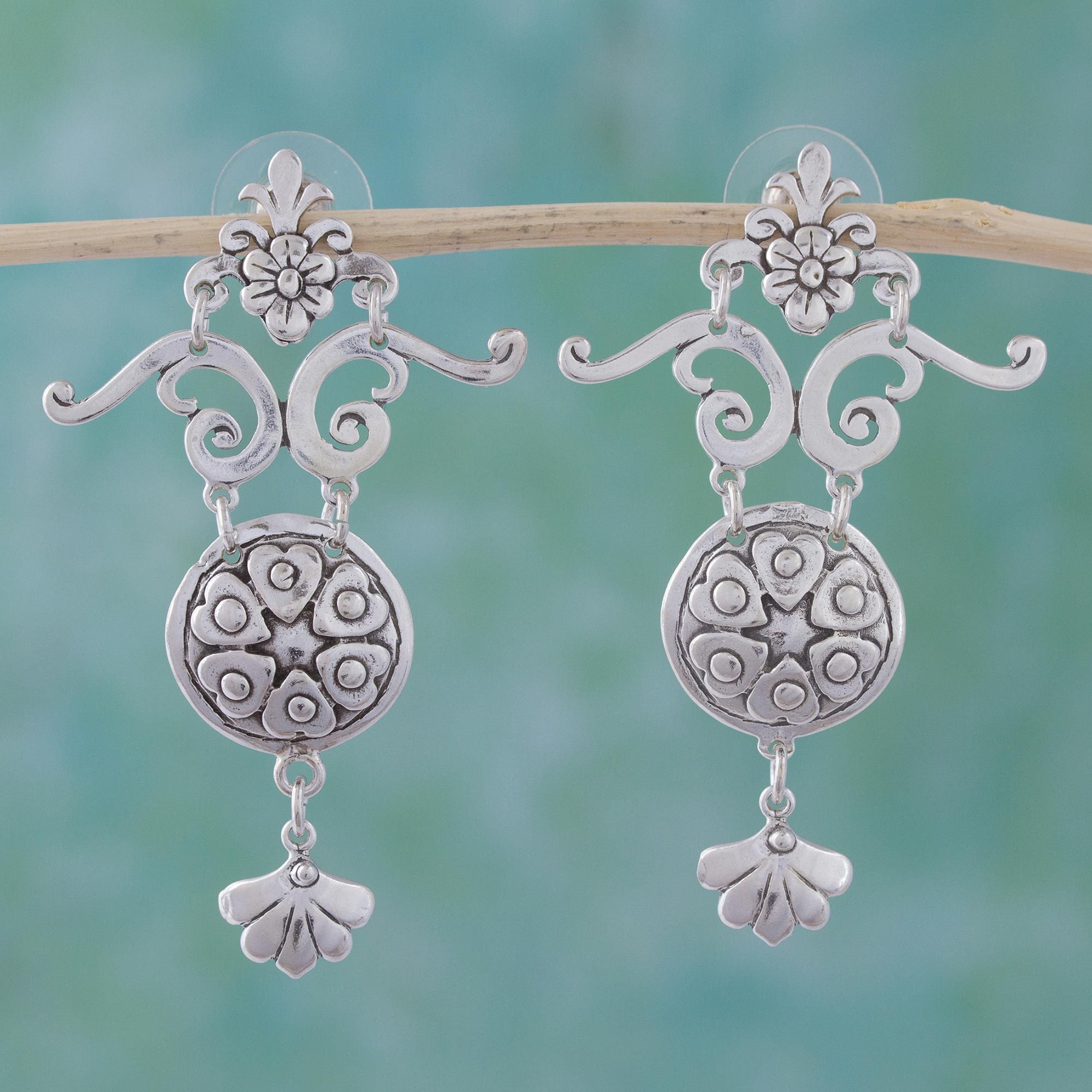 Romantic Sterling Silver Dangle Earrings, 'Hearts and Flowers'
