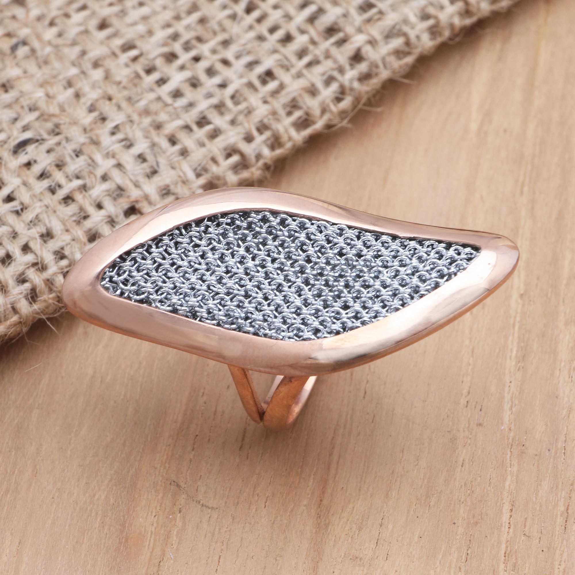 Your friends will turn green with envy when this see you wearing this unique ring designed by Bali's Ayu Widiani. The ring is crafted with a shimmering silver-colored polyester mesh panel that's bordered by a curving 18k rose gold-plated brass frame, while a rose-gold plated brass band completes the look.