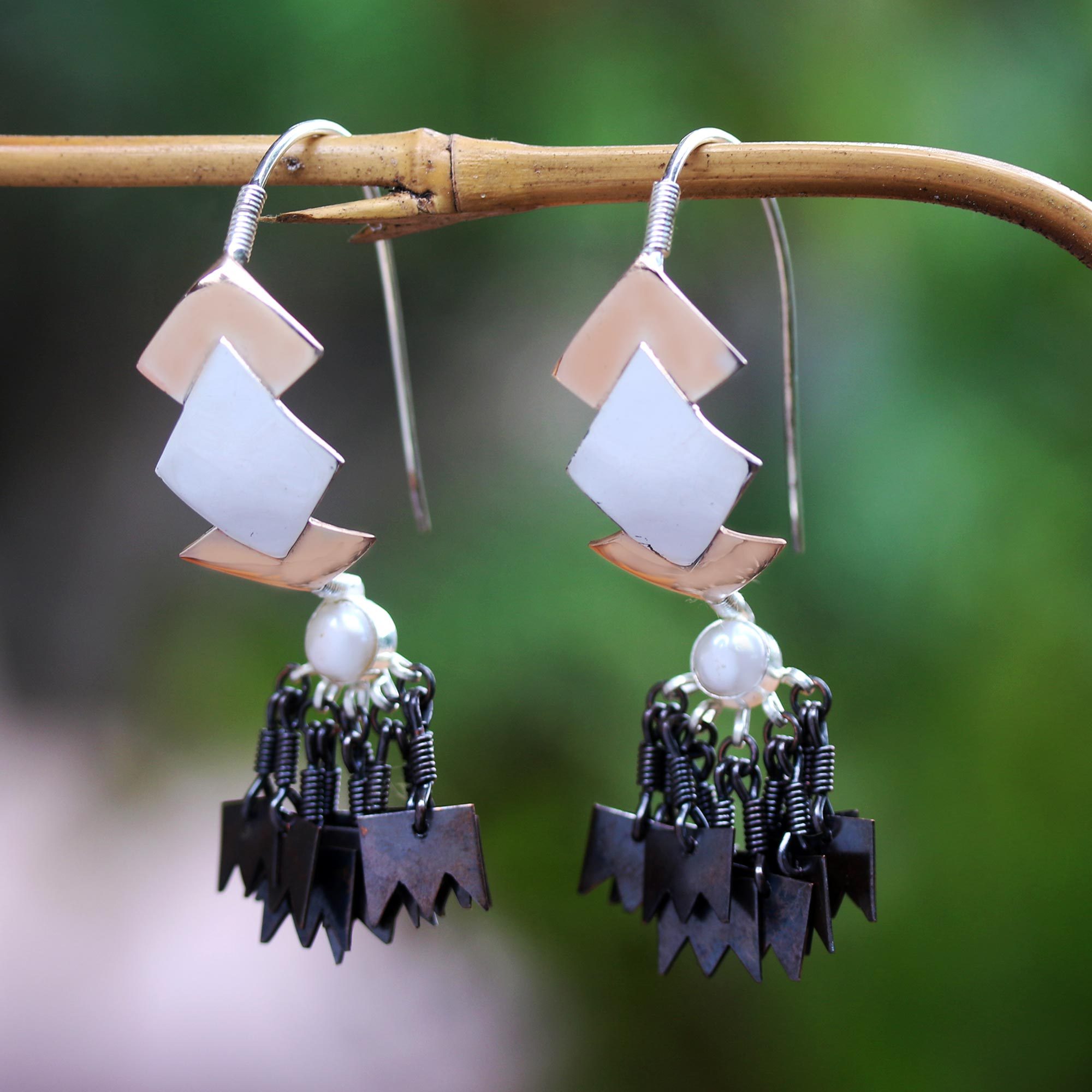 Nyoman Nartawan in Bali uses a trio of shining metals to create these elaborate dangle earrings. The artisan starts by crafting diamond shapes from polished sterling silver and 18k rose-gold plated copper, then fashions a dangling crown motif from dyed copper. A single cultured freshwater pearl, dyed peach, glows at the center of the artful pair.