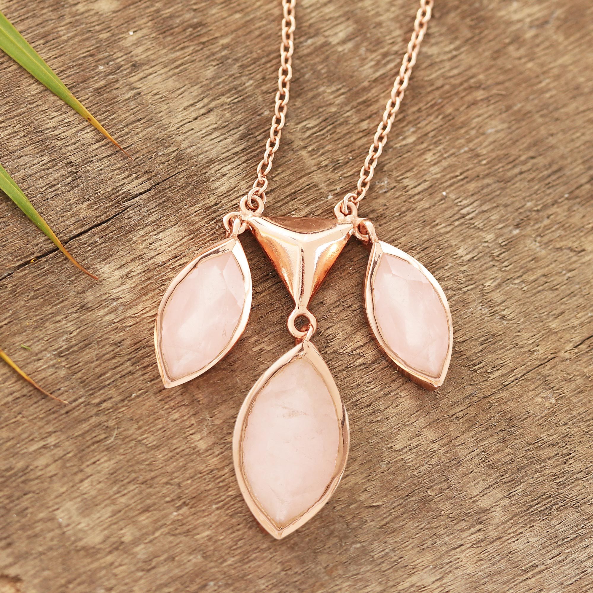 Cut into marquise shapes, three faceted gemstones of rose quartz totaling 12 carats dangle from a gleaming pendant of sterling silver bathed in 18k rose gold. Neetu Barathi designs this Indian pendant necklace, fit for a princess.