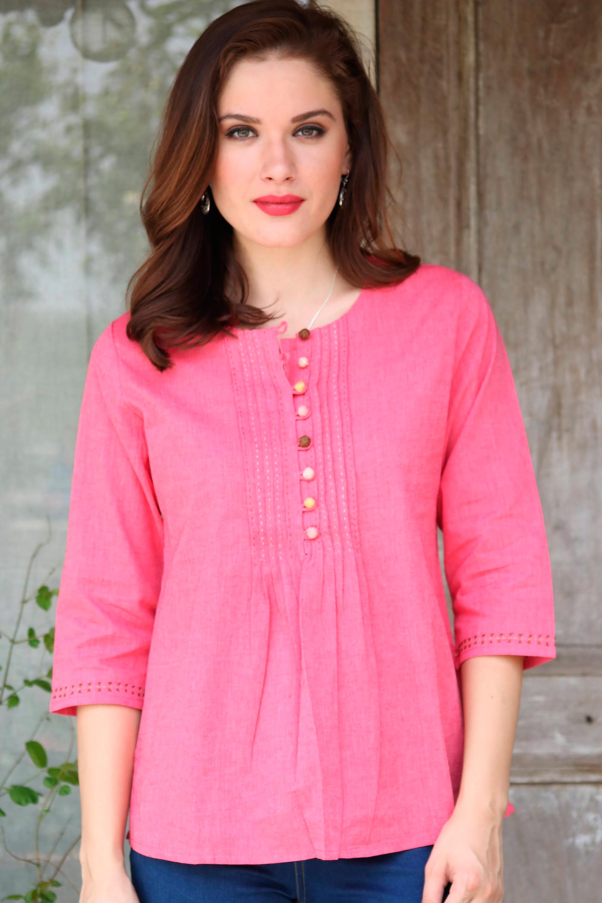 Rose Pink 100% Cotton Embroidered Front Button Tunic, 'Elegant Rose'